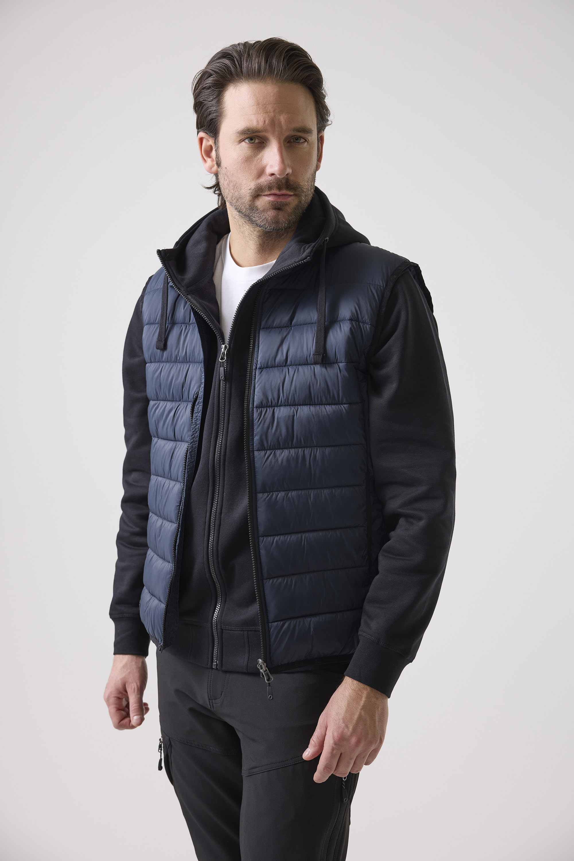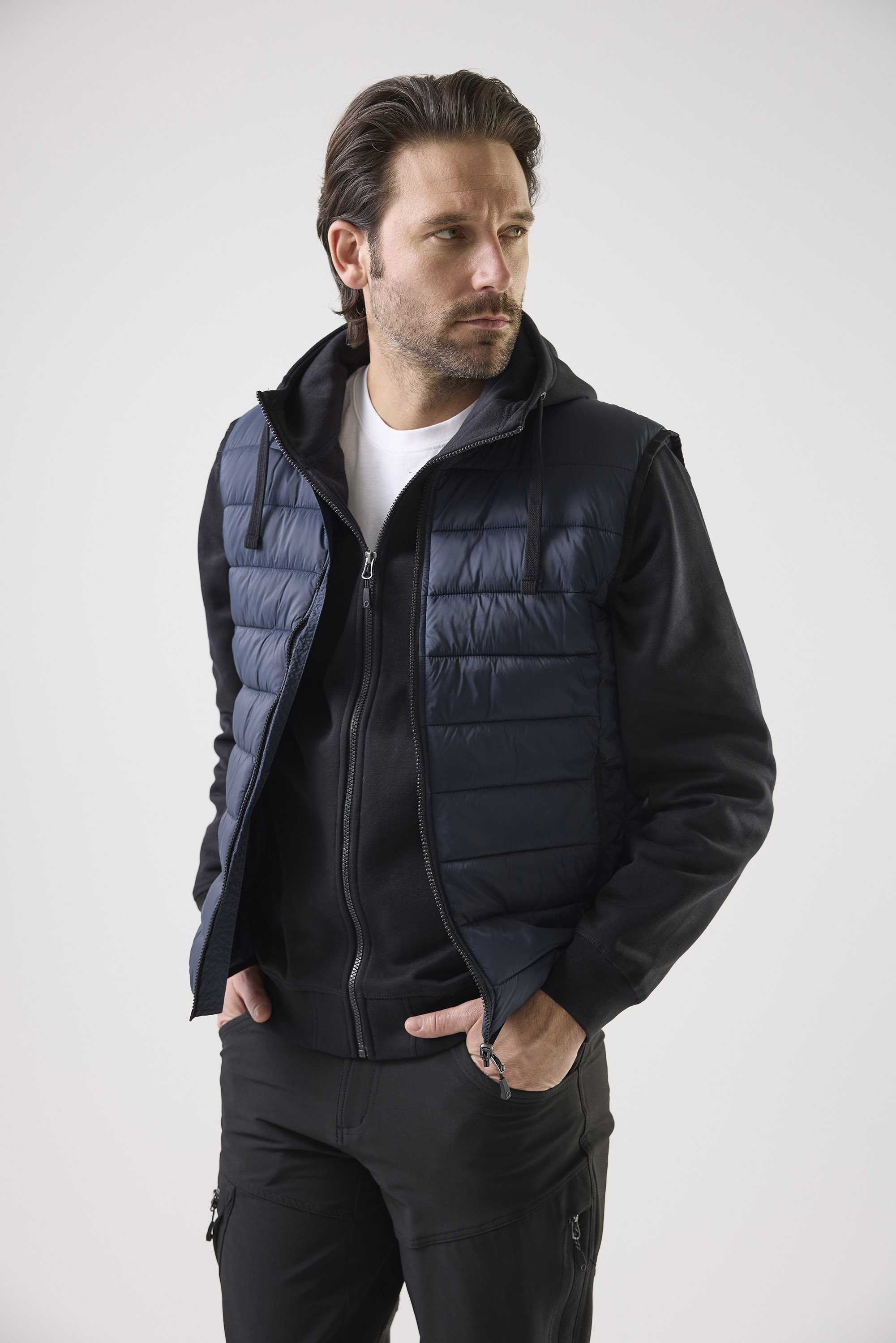 Lightweight vest with faux down and a close fit. Can be used alone or attached to the Ames shell jacket as a warm torso liner. Narrow channels keep the down in place. Two side pockets. Elastic bands at hem and armholes.