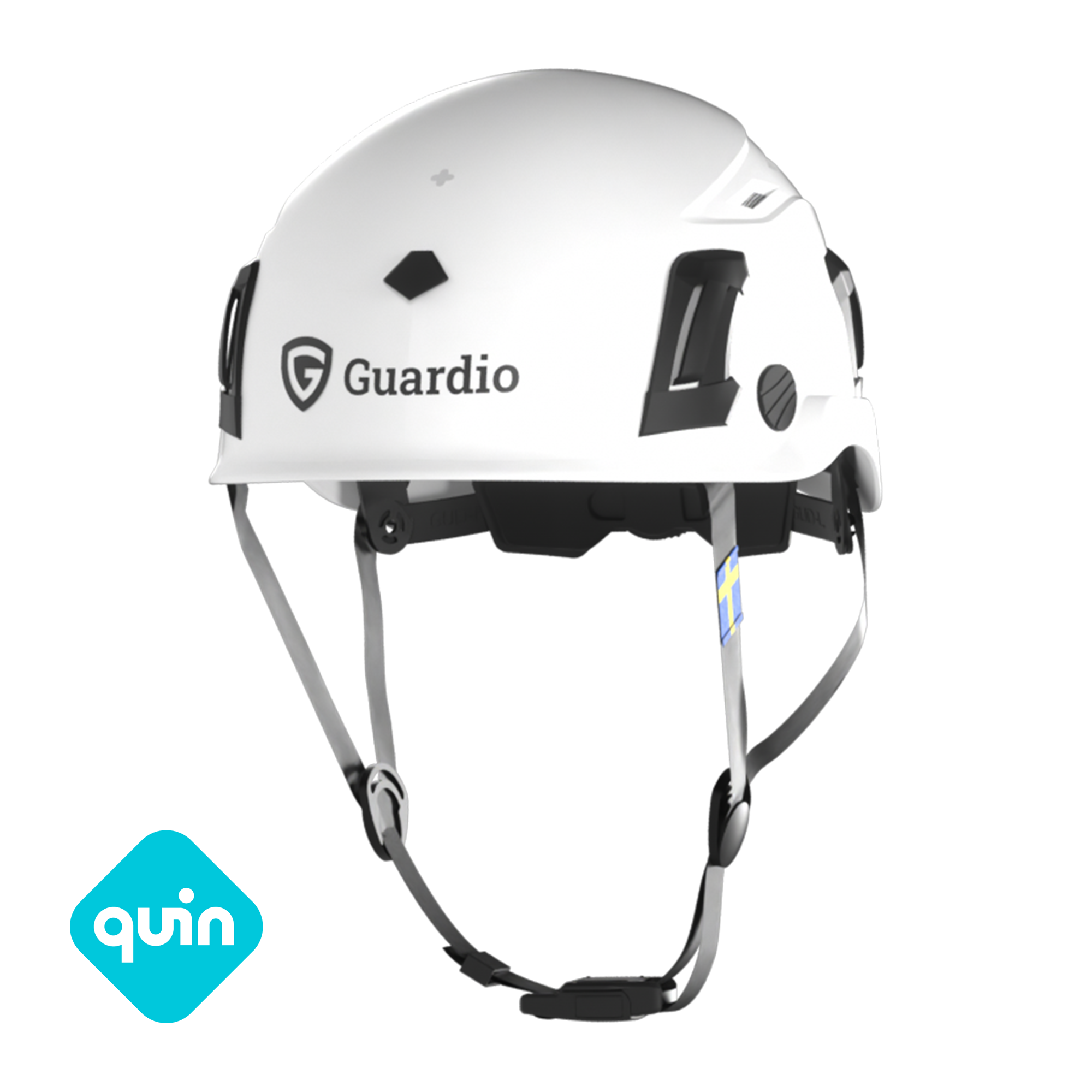 Smart safety helmet compliant with EN397:2025 Type II with integrated Quin Pod measuring impact forces in real time and alerting contacts in case of accident. Quin Tag stores medical ID. Equipped with Mips, JetStream VentSystem with CoolMax, Fidlock faux leather chin strap and LED diffuser.