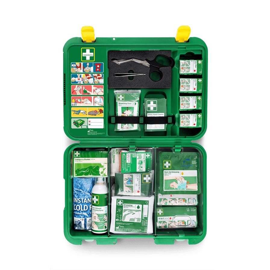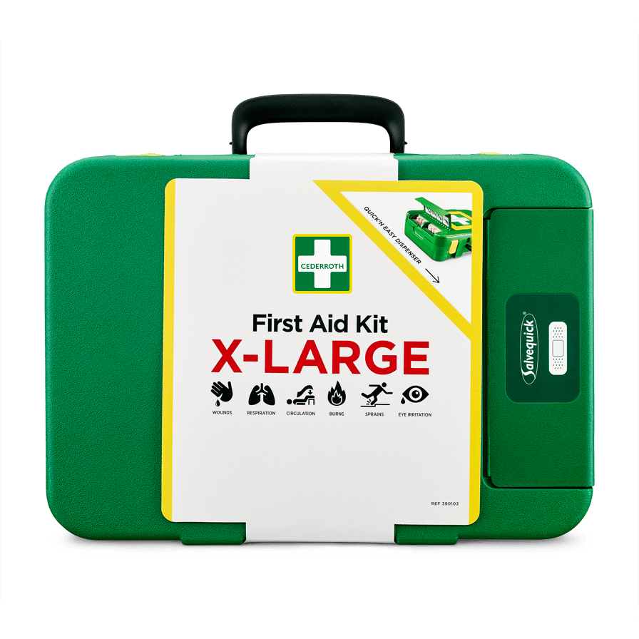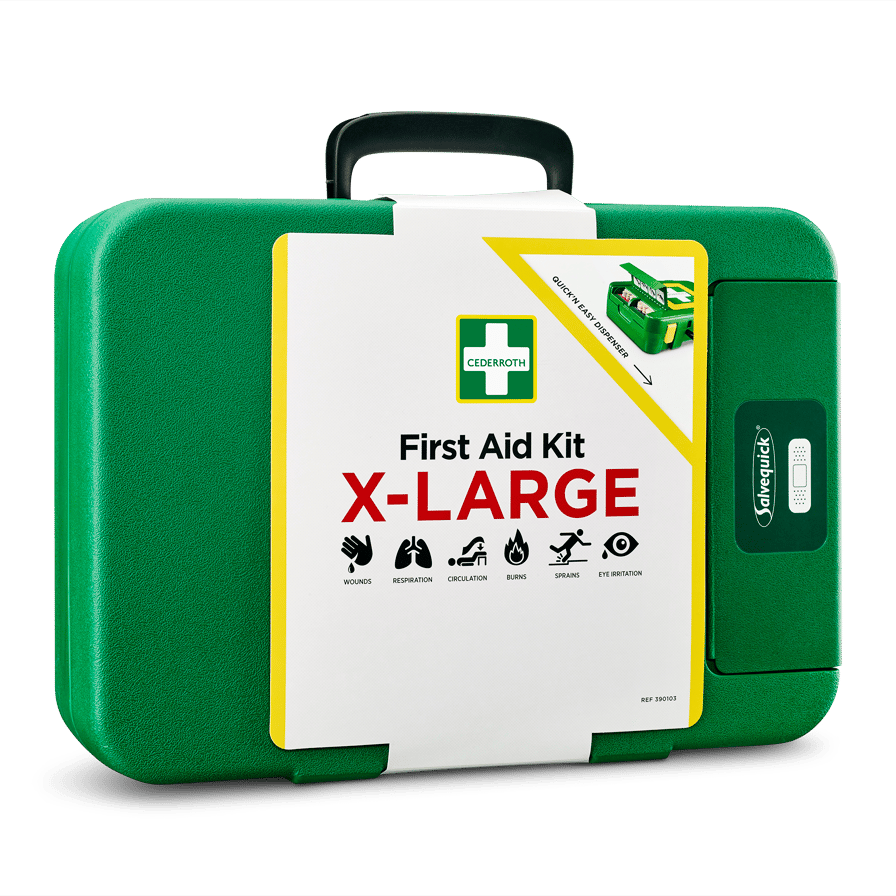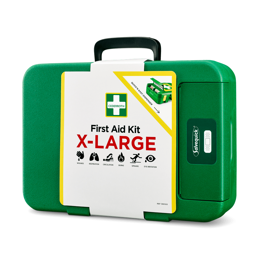 Cederroth Ensiapupakki X-Large on erinomainen lisä seinällä olevalle ensiapuasemalle yrityksissä, joiden työntekijät ovat usein liikkeellä. Ensiapupakki X-Large on helppo ottaa mukaan myös tilanteisiin, joissa apua tarvitaan etäämmällä. Kovamuovista valmistettu lujatekoinen ja kestävä pakki pitää pölyn, kosteuden ja lian loitolla jopa vaativissa ympäristöissä. Laastarinannostelija, joka on sijoitettu pakkauksen ulkopuolelle, tekee laastarin ottamisesta nopeaa ja helppoa, jättäen laukun sisällön koskemattomaksi, kunnes sitä todella tarvitaan. Helposti avattavat ja näkyvät soljet. Selkeä yleisnäkymä tekee oikean tuotteen löytämisestä vaivatonta. Tuotteet kuten käsineet, sakset ja elvytyssuoja on sijoitettu pakin sisäkanteen. Punaiset täydennystarrat kertovat, milloin on aika täydentää. Pakkaus on hyvin varusteltu niin pieniin kuin suuriinkin haavoihin, nyrjähdyksiin, palovammoihin, verenkierron häiriöihin, lieviin silmävammoihin ja elvytyksessä tarvittaviin suojaustuotteisiin. Pakkausta voi täydentää silmänhuuhtelulla. Seinäpidike on saatavilla lisävarusteena. Sisältö: 3 Cederroth 4-in-1 iso ensiapuside (REF 1910) 4 Cederroth 4-in-1 pieni ensiapuside (REF 1911) 45 Salvequick muovilaastari (REF 6036) 40 Salvequick kangaslaastari (REF 6444) 10 Salvequick haavapyyhe (REF 510005534) 2 Cederroth Burn Gel palovammataitos (REF 901900) 2 Soft Foam laastari 6 x 40 cm (REF 51011023) 1 Huuhteluspray (REF 726000) 2 Elastinen tukiside 8 cm x 4 m (REF 1882) 3 Metalloitu haavaside 20 x 40 cm (REF 1893) 2 Verkkoside (REF 1893) 1 Salvequick Cold Pack kylmäpussi (REF 219600) 1 Elvytyssuoja (REF 2596) 4 Paria suojakäsineitä (REF 2596) 4 Käsienpuhdistuspyyhe (REF 2596) 1 Pelastuspeite (REF 1892) 1 Sakset (REF 270002) 1 Pinsetit (REF 1875) 1 Ensiapuohje 1 Sisällysluettelo Mitat: L 420 × S118 × K 300 mm