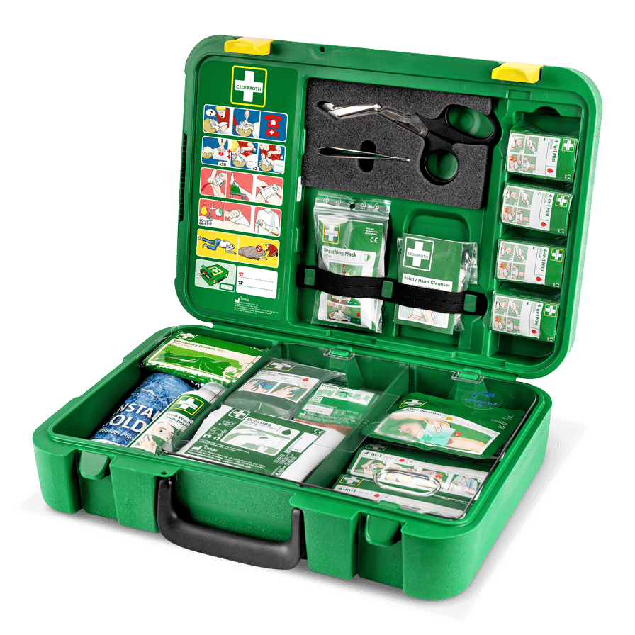 Kestävä kovamuovinen ensiapupakki, jossa laastarinannostelija. Kotelo suojaa iskuilta, pölyltä ja kosteudelta. Tuotteet kuten käsineet, sakset ja elvytyssuoja sisäkannessa. Punaiset tarrat ilmoittavat täydennystarpeesta. Kirkas näkyvä väritys. Tilaa omille tuotevalinnoille, kuten silmänhuuhtelulle.