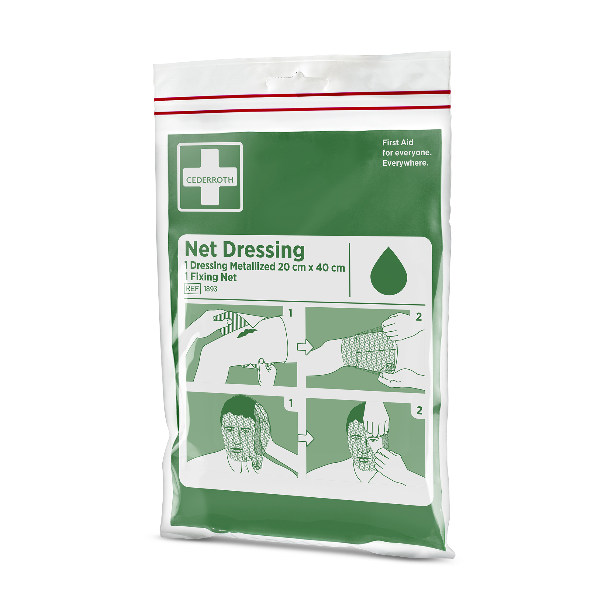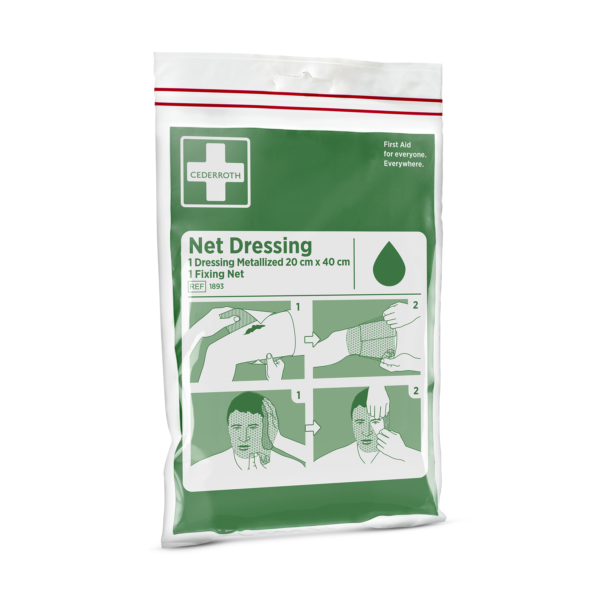 Metalloitu kompressi 20x40 cm, jossa on kiinnitysverkko, tarkoitettu päähän kohdistuviin vammoihin, soveltuu myös käsien ja jalkojen sidoksiin.