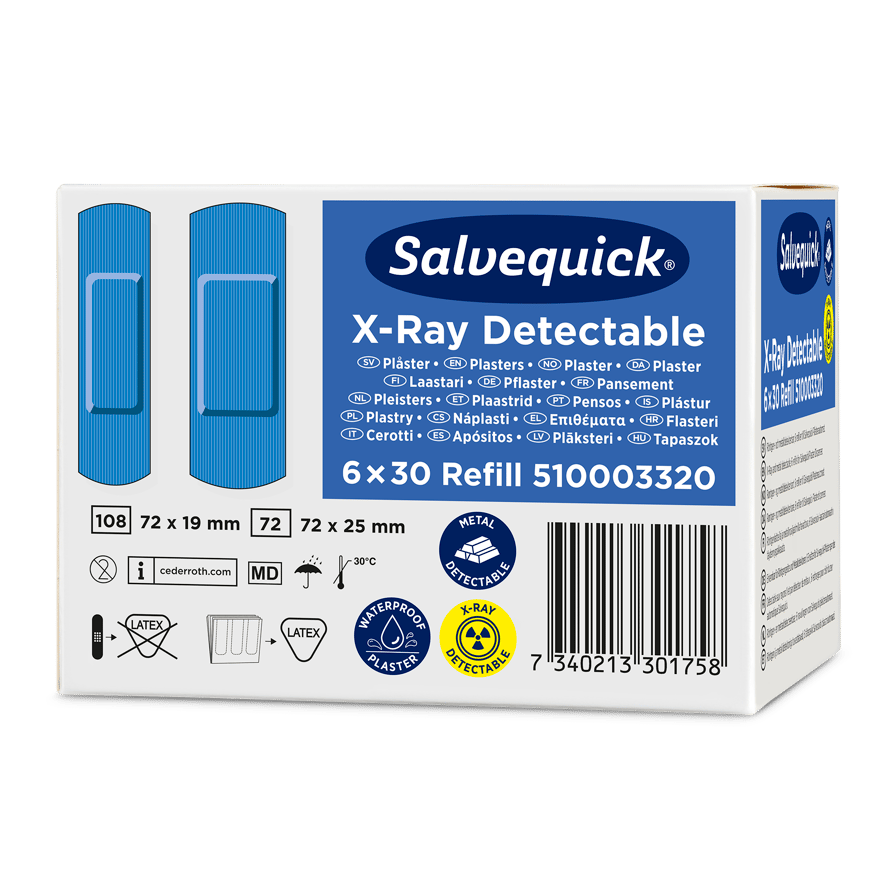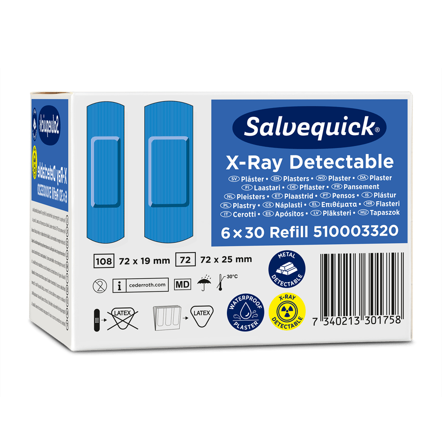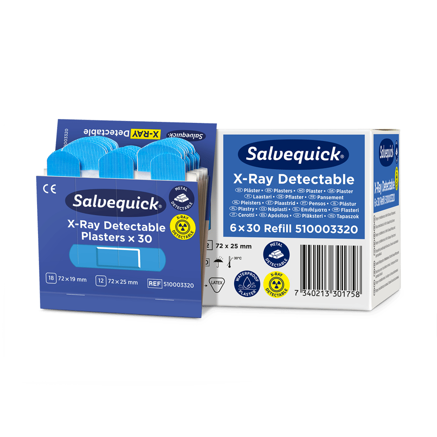Salvequick X-ray jäljitettävä laastari, joka on suunniteltu erityisesti elintarviketeollisuudessa käytettäviksi, ovat sekä röntgen- että metallipaljastimella havaittavia. Sinisen värin ansiosta laastarit on helppo havaita visuaalisesti. Laastarit ovat vedenpitäviä ja allergiatestattuja. Ne ovat helppoja asettaa, joustavia ja sileitä käyttää. Sopii Salvequick laastariautomaattiin. Täydennyspakkaus sisältää 30 laastaria (18 kpl 72x19 mm ja 12 kpl 72x25 mm). 6 täydennyspakkausta/rasia.