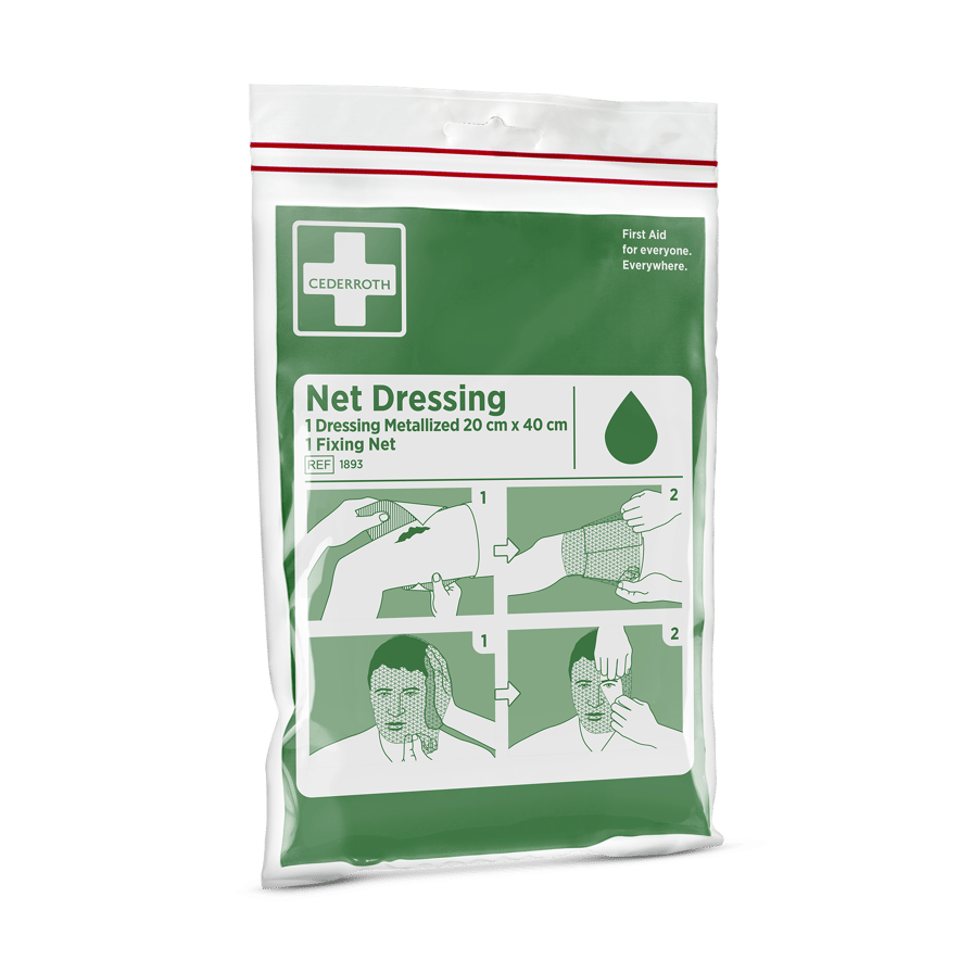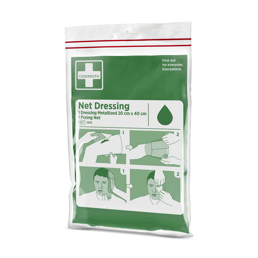 Metalloitu kompressi 20x40 cm, jossa on kiinnitysverkko, tarkoitettu päähän kohdistuviin vammoihin, soveltuu myös käsien ja jalkojen sidoksiin.