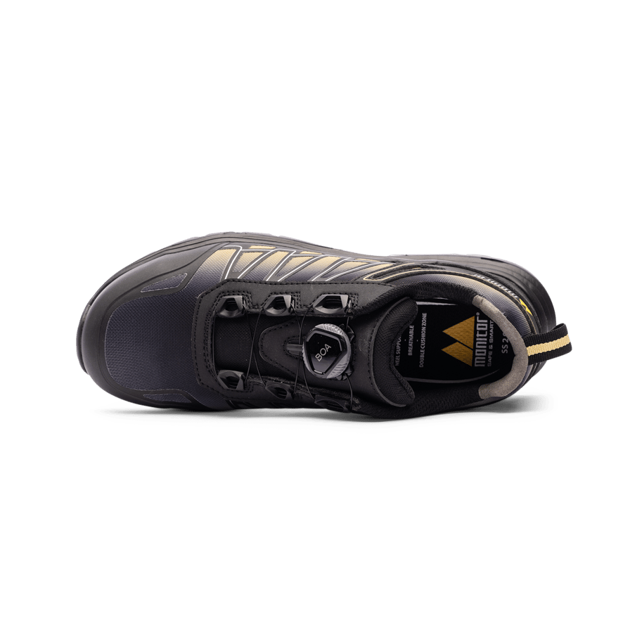 Sky Safety Shoe w on Monitorin turvakenkä, jossa on mikrokuitu- ja TPU-päällinen, kosteutta siirtävä verkkovuori, alumiininen turvakärki, Pantzar APT -naulaanastumissuoja ja liukumaton kumipohja. Varustettu BOA® Fit System -järjestelmällä.