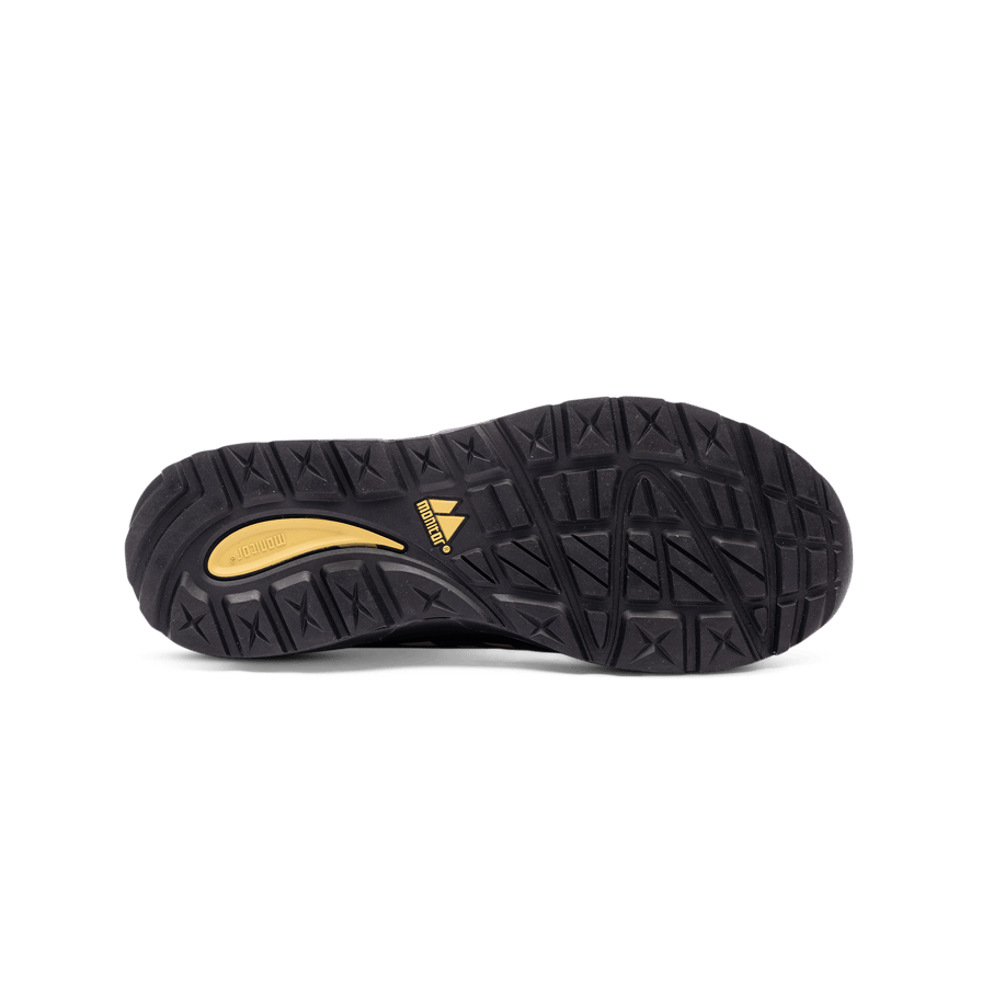 Sky Safety Shoe w on Monitorin turvakenkä, jossa on mikrokuitu- ja TPU-päällinen, kosteutta siirtävä verkkovuori, alumiininen turvakärki, Pantzar APT -naulaanastumissuoja ja liukumaton kumipohja. Varustettu BOA® Fit System -järjestelmällä.