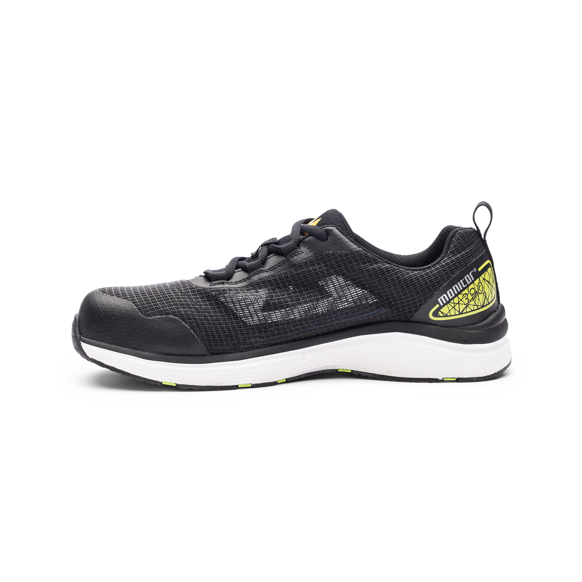 Monitor Three 100 Ninety Safety Shoe on kevyt turvakenkä, jossa on Hypertex-päällinen, alumiininen turvakärki ja Pantzar-naulaanastumissuoja. Kengässä on EVA-välipohja, nitriilikuminen ulkopohja ja kierrätetty PU-pohjallinen.