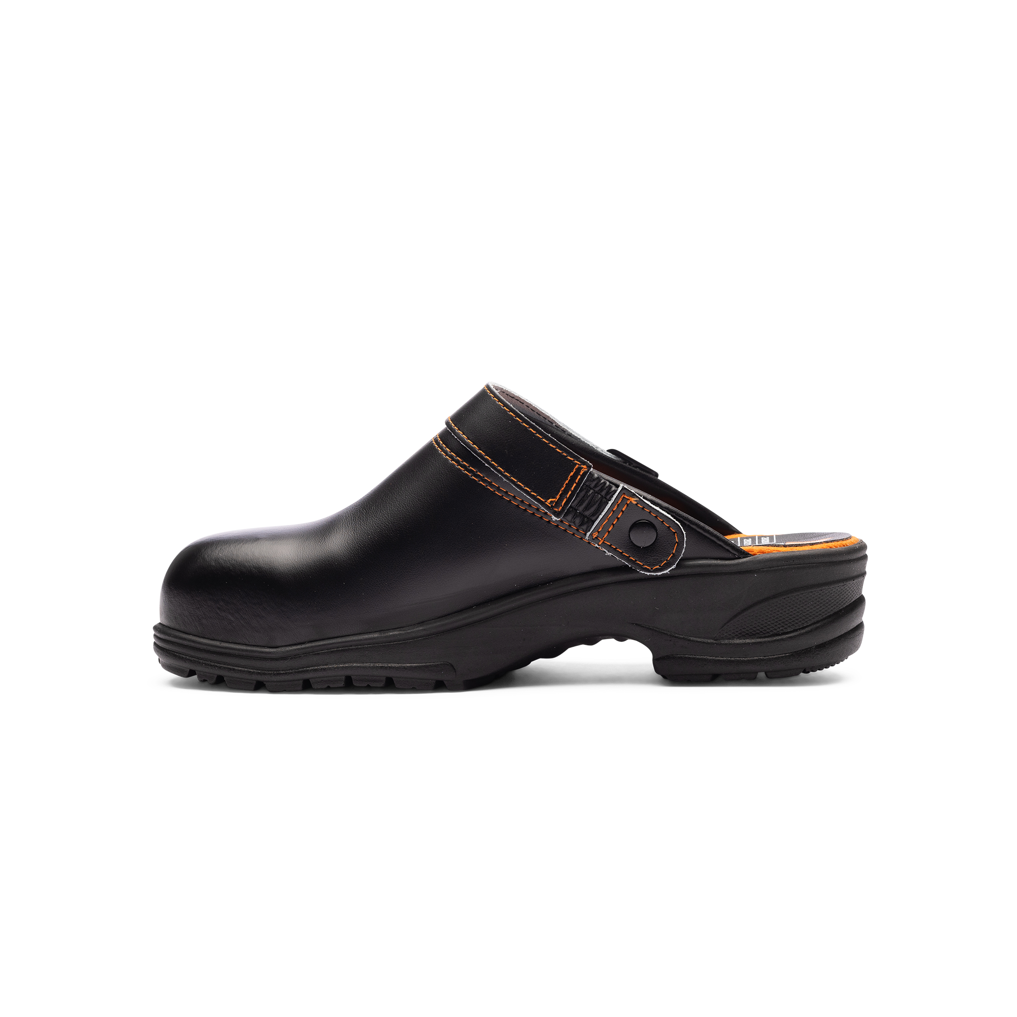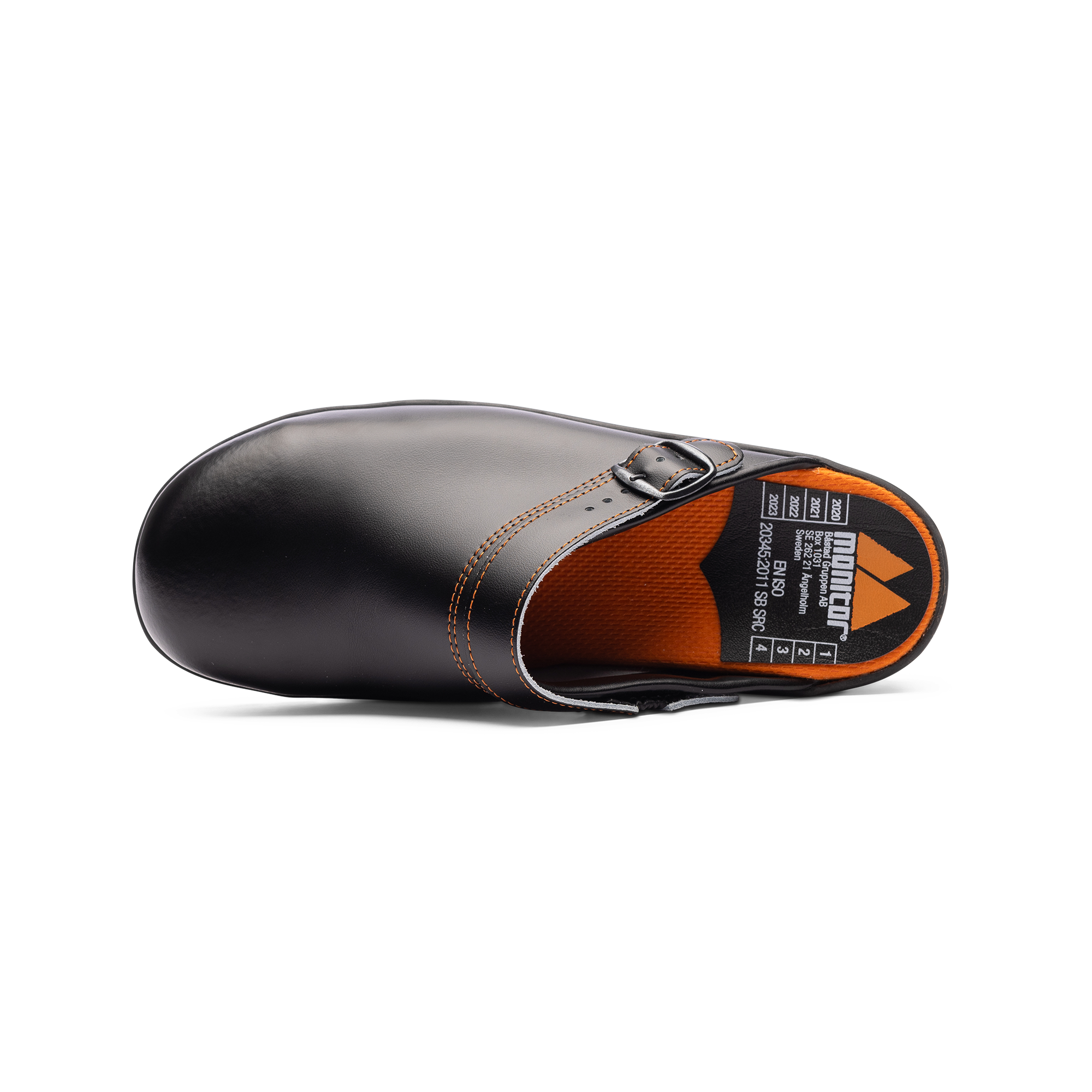 Monitor Ymer Safety Clog on klassinen turvajalkine, jossa on kestävä PU-pinnoitettu nahkapäällinen ja SRC-sertifioitu liukastumista estävä pohja. Pohjallinen on ergonomisesti muotoiltu ja päällystetty kosteutta imevällä Cambrelle-tekstiilillä.