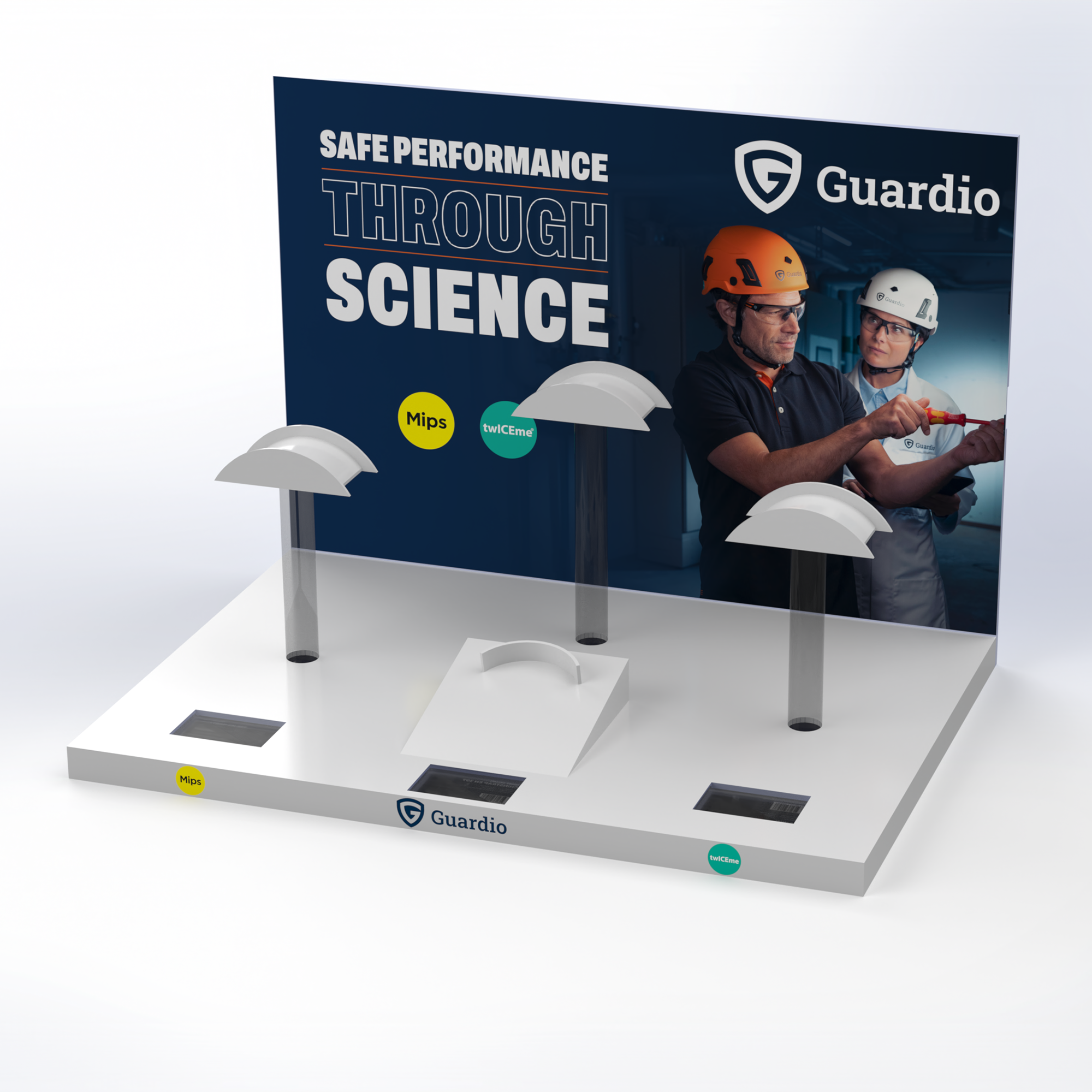 Guardion kypärille ja kuulosuojaimille räätälöity tuote-esittely. Vaihdettava painatus, jotta viestiä voidaan mukauttaa eri kampanjoihin.700 x 480 x 500mm