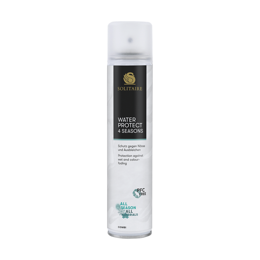 Solitaire Water Protection 4 Season on PFC-vapaa kyllästesuihke nahalle ja tekstiileille, myös TEX-kalvolla varustetuille materiaaleille. Tarjoaa hengittävän suojan kosteutta, likaa ja värien haalistumista vastaan. Säilyttää värin intensiteetin ja pidentää kenkiesi käyttöikää. 200 ml.