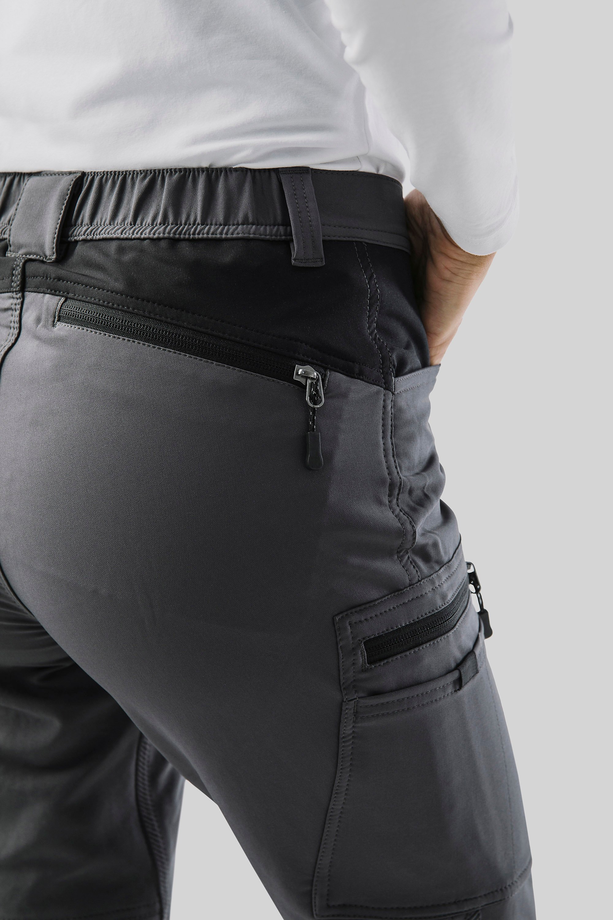 Käytännölliset 5-taskuiset hybridihousut, joissa on naisten leikkaus ja joustava laatu optimaalisen liikkumisvapauden ja mukavuuden takaamiseksi. Reisitaskut ja takatasku vetoketjuilla ja heijastavilla yksityiskohdilla. Napit lahkeiden alaosassa lahkeenleveyden säätöä varten.