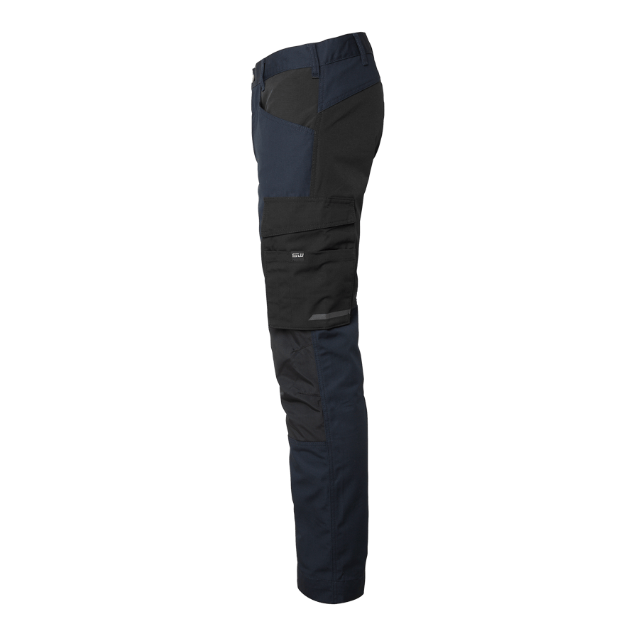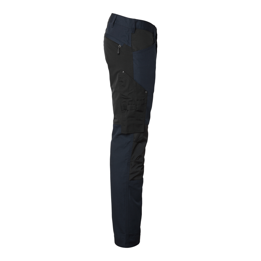 Modernit työhousut, joissa on kevyttä ja kestävää materiaalia sekä joustotoiminto valituissa kohdissa. Varustettu tilavilla taskuilla, mitta- ja reisitaskulla, kaksitasoisilla polvisuojataskuilla ja lisävahvikkeilla. Heijastava yksityiskohta vasemmassa lahkeessa.