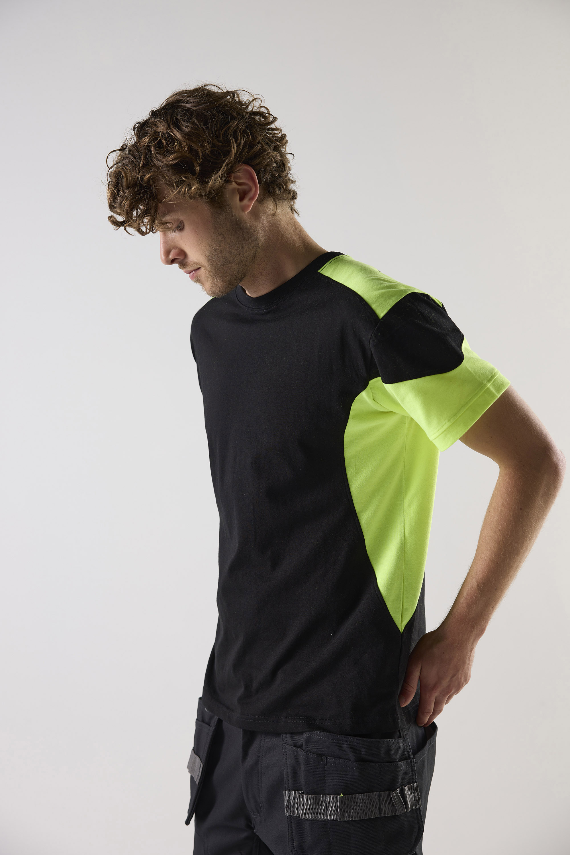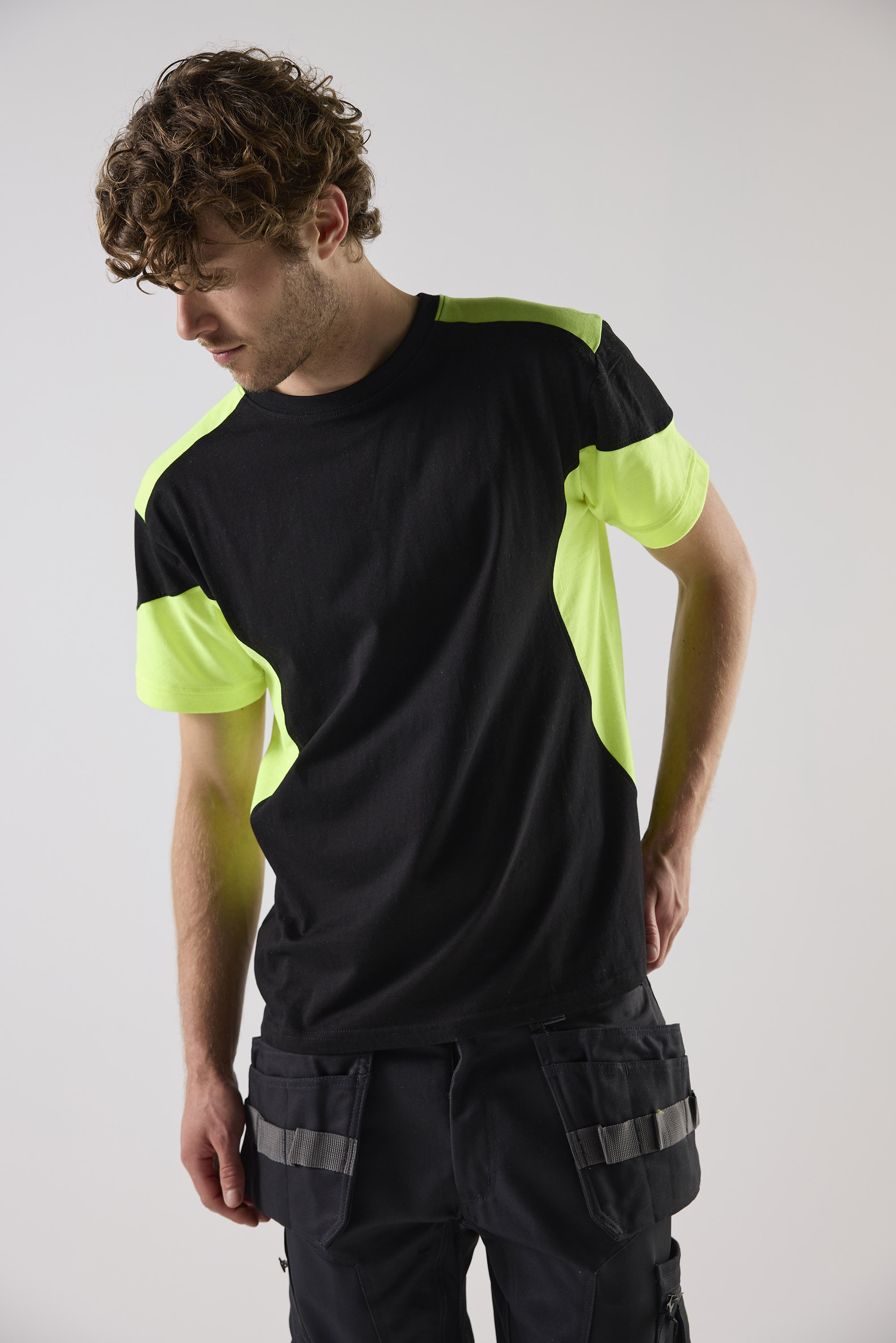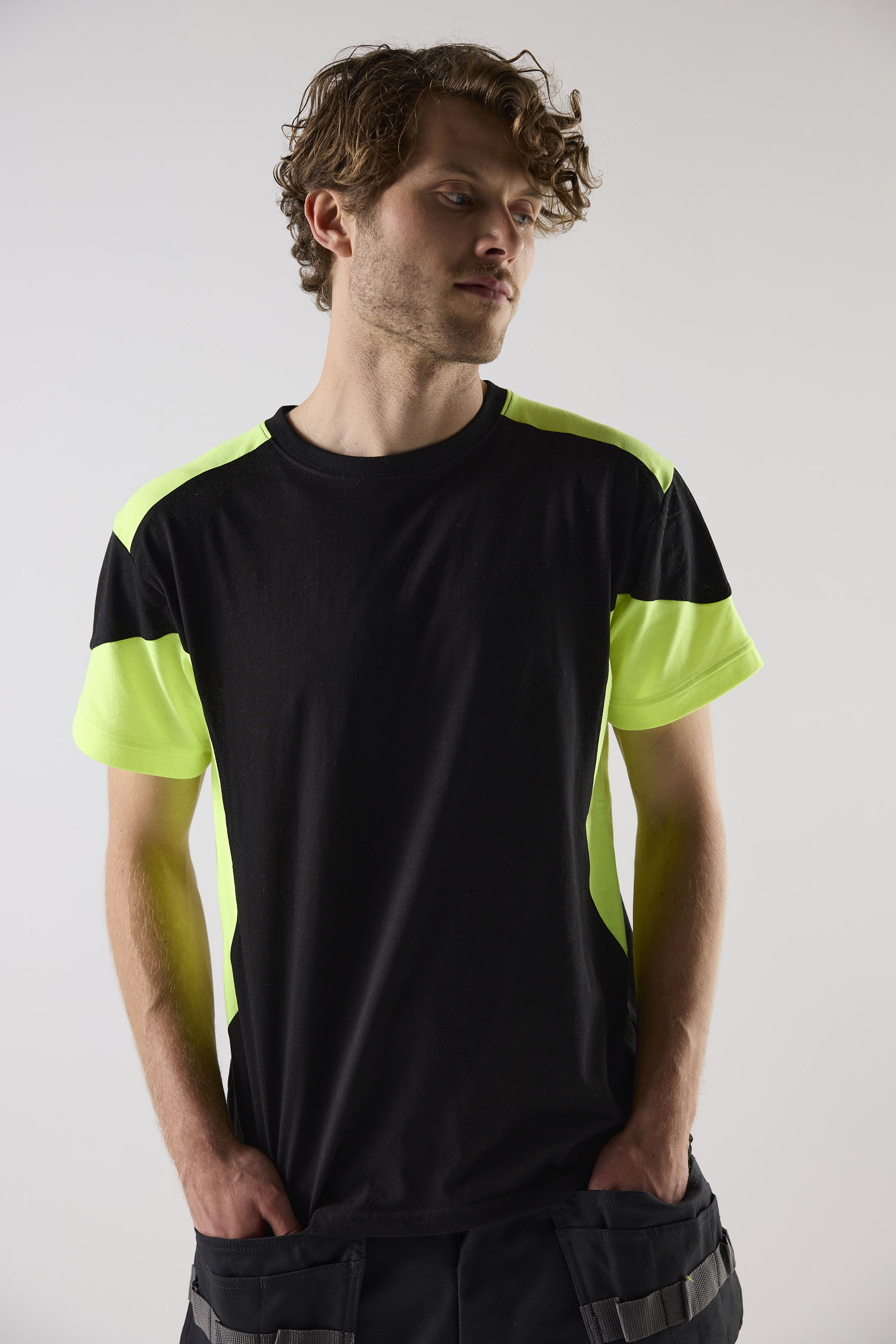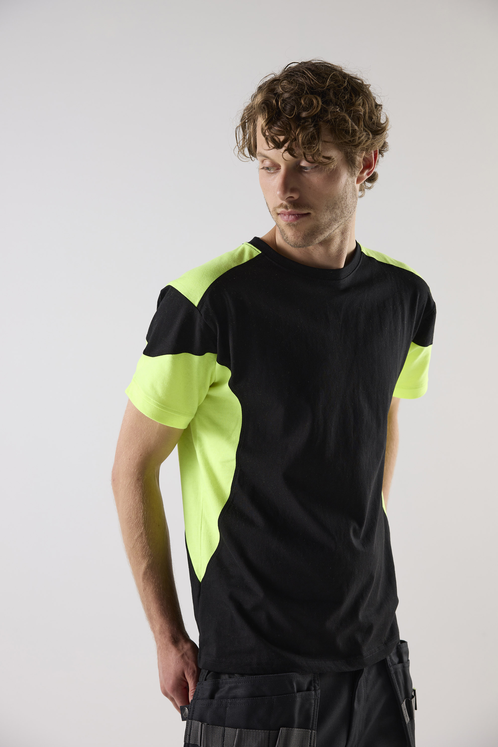 Top Swede huomio T-paita. Pyöreä kaula-aukko ja kaksinkertainen kaulanauha elastaanilla. Valmistettu puuvillan ja polyesterin sekoituksesta mukavan olon ja kestävyyden takaamiseksi. Sopii erityisesti rakennus- ja teollisuusalalle.