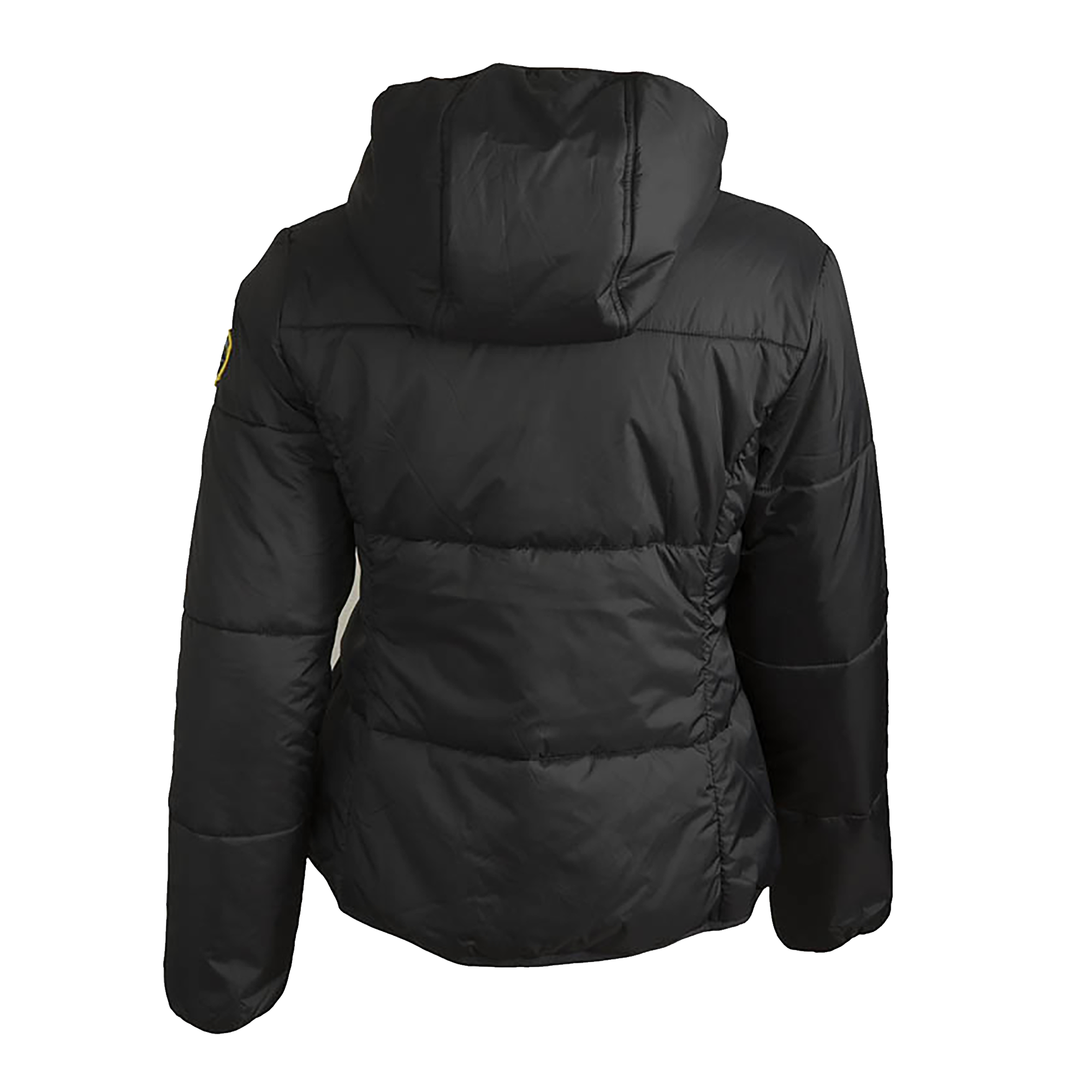 Talvivuorillinen naisten tikkitakki kiinteällä hupulla. Kontrastimateriaali rintataskussa.Tuulenpitävä ja vettähylkivä. Kaksi sivutaskua ja rintatasku.