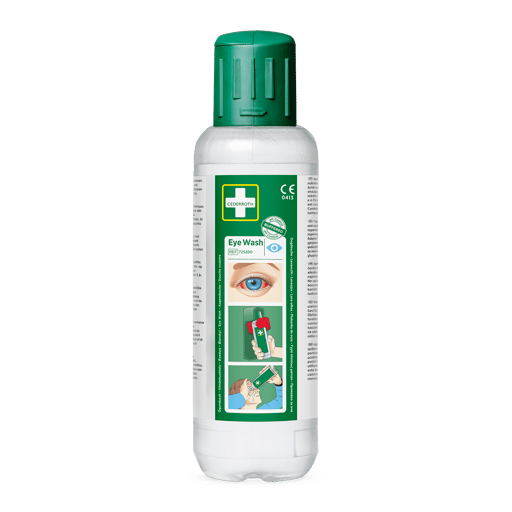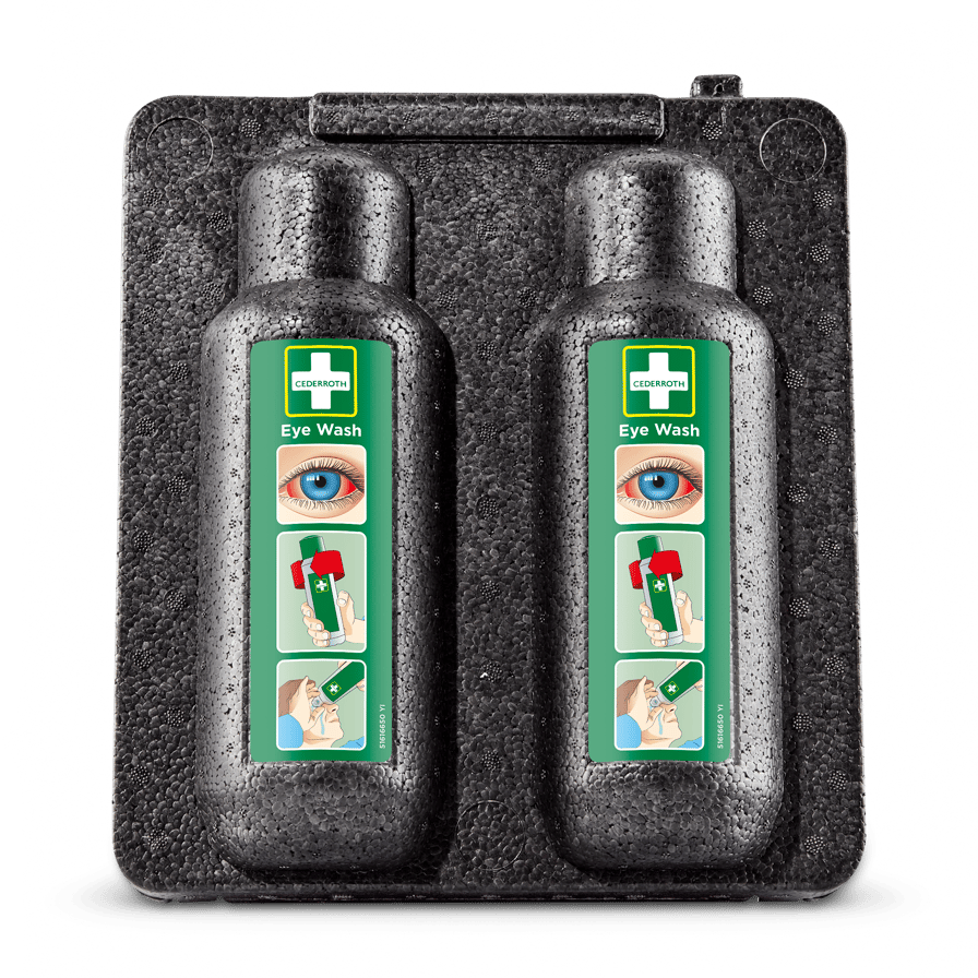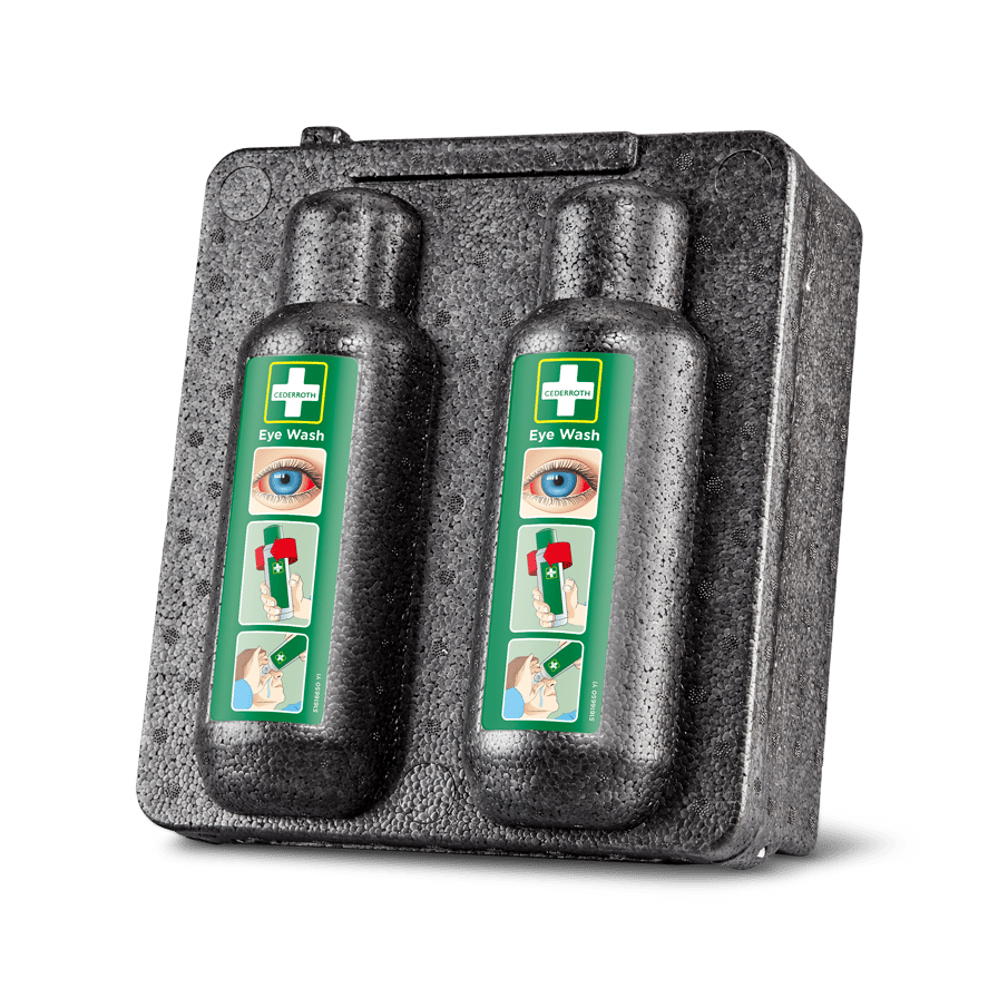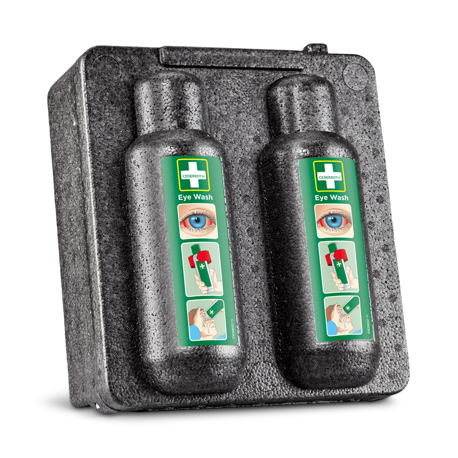 Varmekabinett for to flasker Cederroth Øyedusj (REF 7251) i kalde miljøer; holder +20 °C ved omgivelse ned til −20 °C; isolert slagfast kjemikalieresistent EPP, termostatstyrt element i aluminium; 12/24 V (230 V m/transformator), plugg for sigarettenner; spenningsvakt; CE- og elsikkerhetstestet; tilbehør: transformator REF 790500.