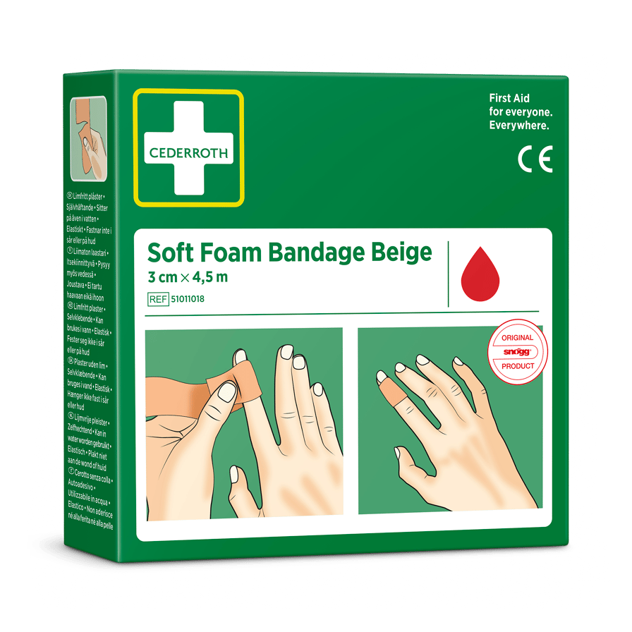 Cederroth Soft Foam Bandage Beige med 3 cm bredde passer perfekt for fingre eller tær. Passer som refill til Soft Foam Bandage 2-in-1 Dispenser (REF 510004108).