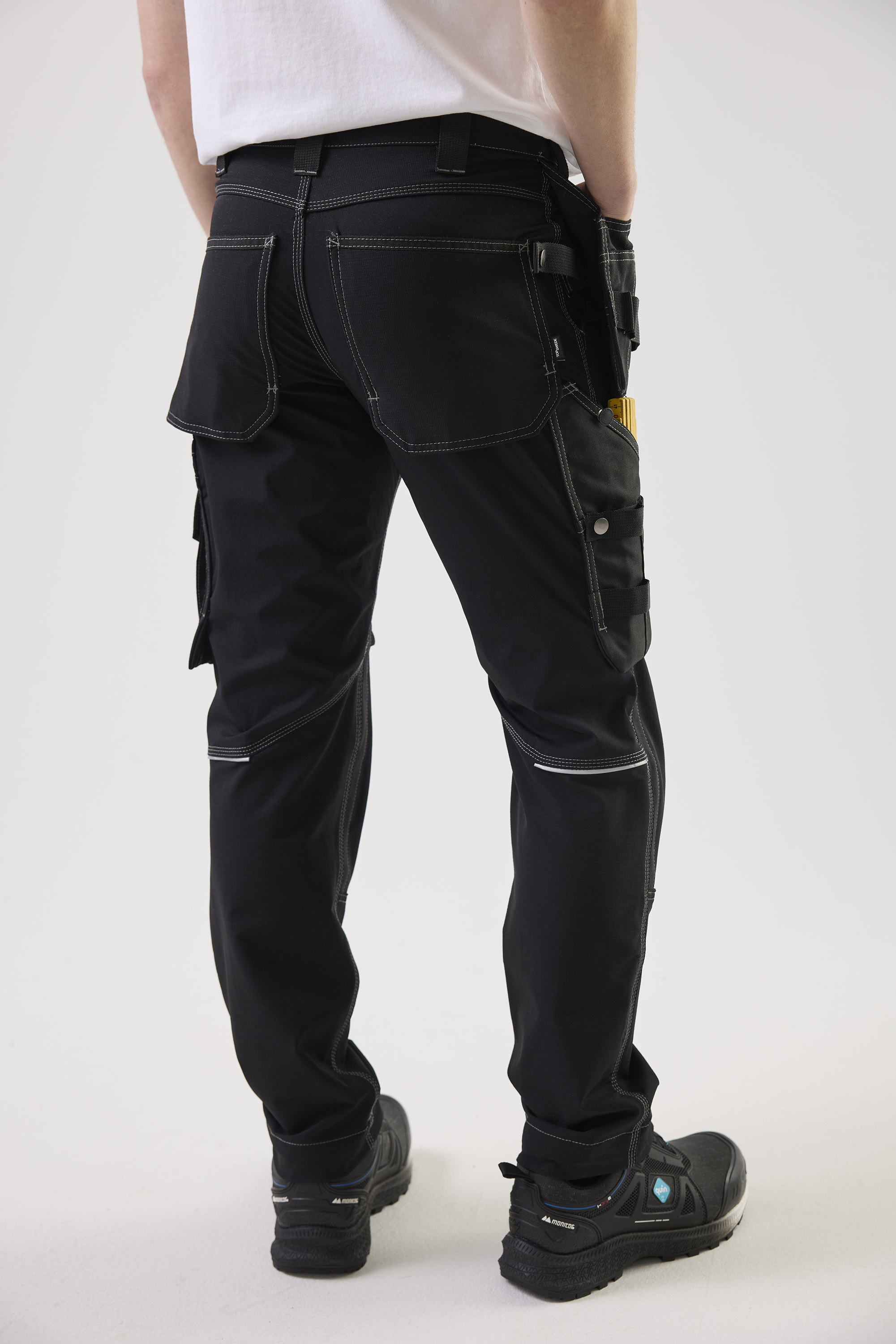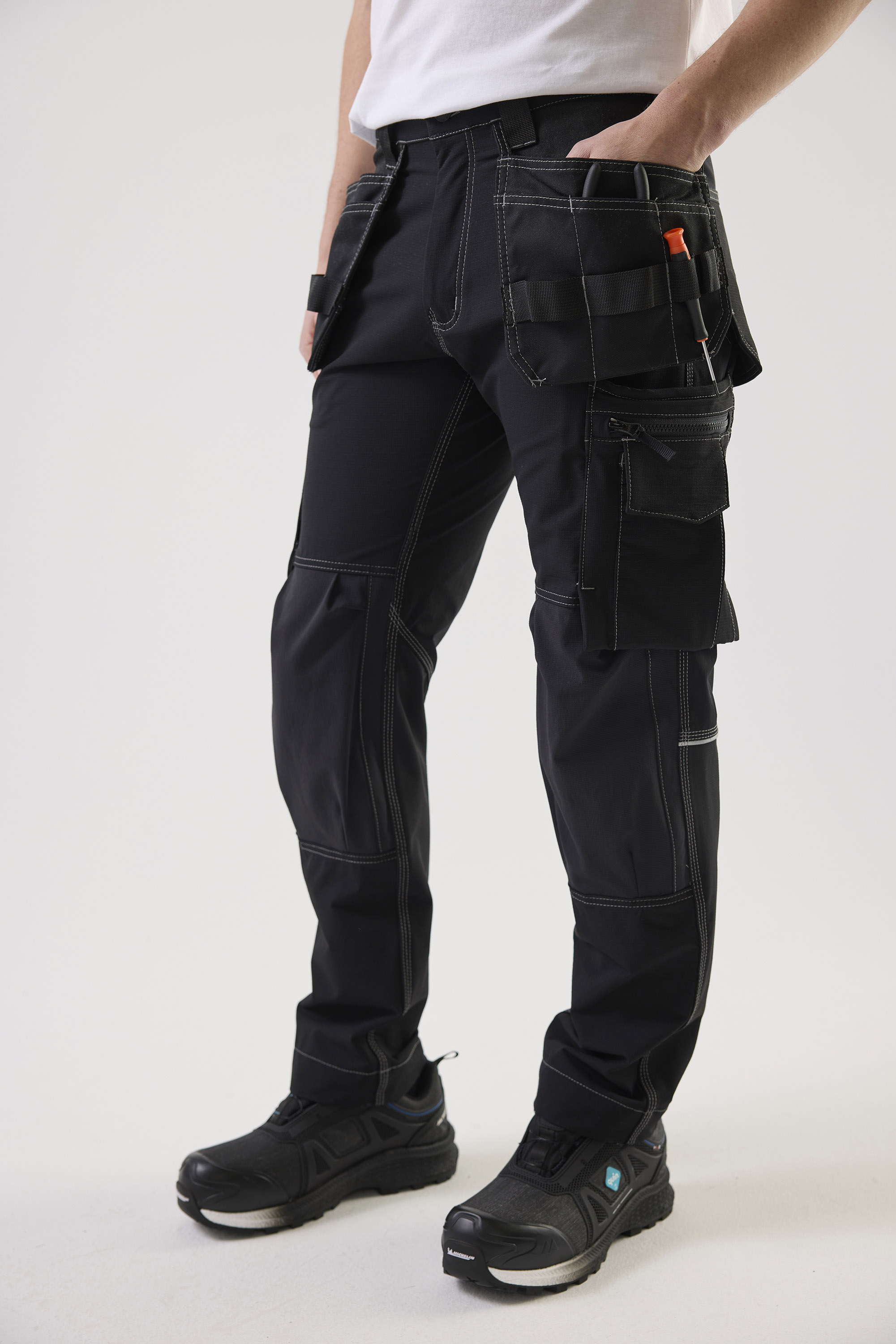 Oppdag Top Swedes 306 Craftsmen Trousers, den ultimate håndverkerbuksen for profesjonelle innen bygg og industri. Buksen har en moderne passform og er laget av et 4-veis stretchmateriale som gir maksimal bevegelsesfrihet og komfort. Buksen har forbøyde ben og knelommer i slitesterk Cordura®, noe som gjør den ideell for tøffe arbeidsmiljøer. Kneputene kan plasseres i to nivåer for ekstra komfort og beskyttelse. Buksen er utstyrt med to frontlommer, to forsterkede baklommer med belg og løstsittende spikerlommer forsterket med Cordura®, som inkluderer tre ekstra rom og verktøystropper. En ID-kortlomme og et justerbart hammerhåndtak gjør dem ekstra praktiske. Den utstikkende linjal-lommen, som er senket i bunnen for bedre komfort, er utstyrt med to knivholdere, en knivsløyfe og en pennelomme. Det finnes også en benlomme med glidelås, en stor reservelomme og en telefonlomme. Refleksdetaljer på baksiden øker synligheten og sikkerheten. Velg 306 Craftsmen Trousers for en kombinasjon av slitestyrke, funksjonalitet og komfort som oppfyller de høyeste standarder for arbeidsklær.