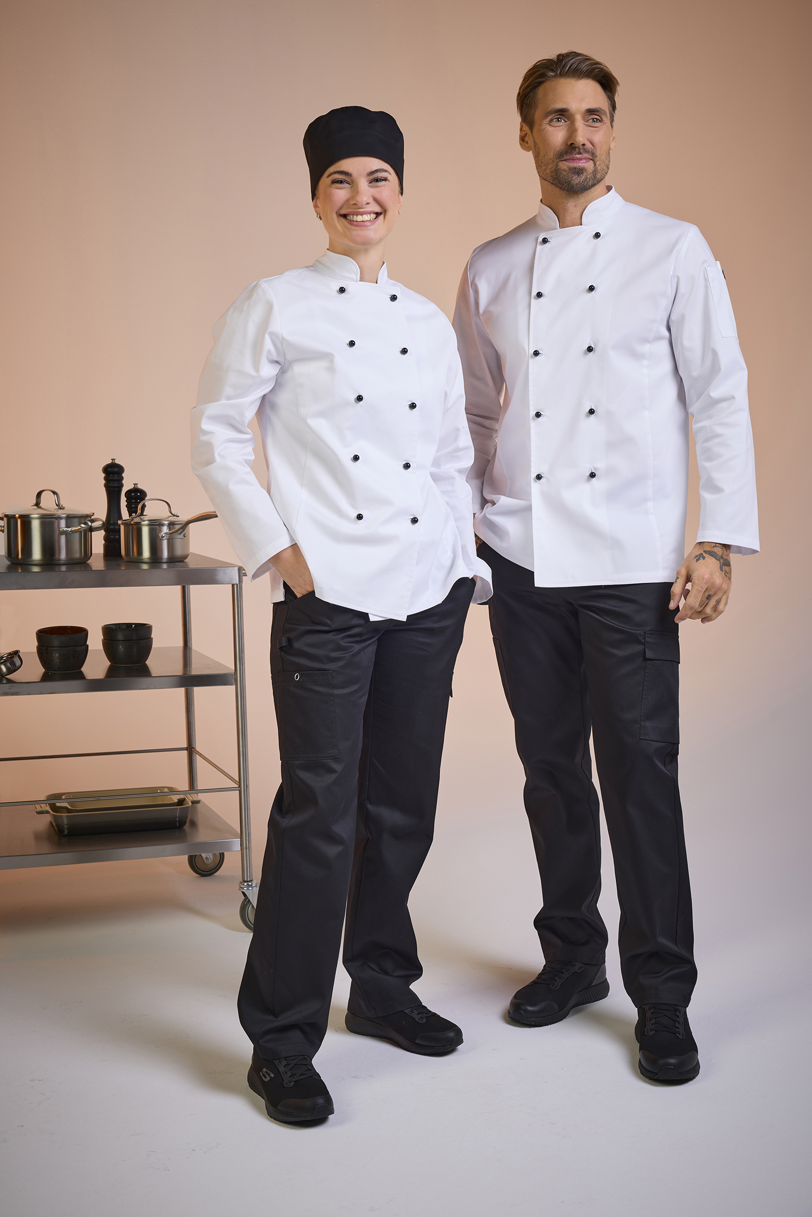 Elsa Chef’s Coat w er en klassisk kokkefrakk i damemodell med dobbeltknepping. Kokkefrakken har en romslig passform og lange ermer med enkle ermeavslutninger med splitt som er lett å brette opp. Frakken har pennelomme på venstre erme og en hempe i nakken. Knapper er ikke inkludert, men kan kjøpes separat i 10-pakning.