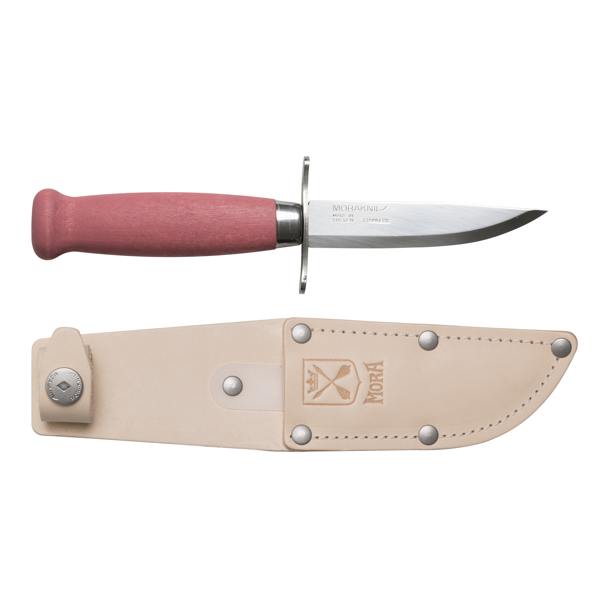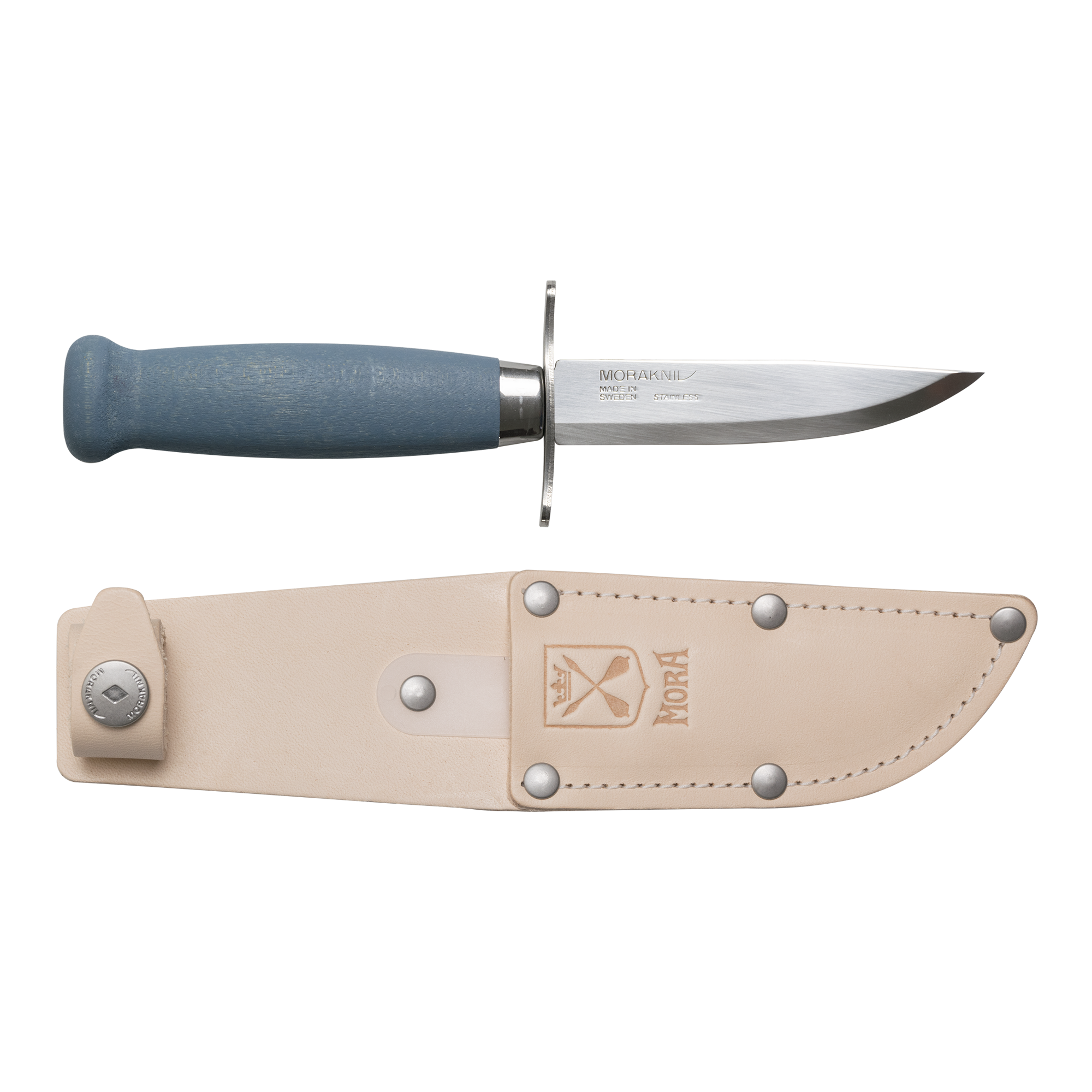 En klassisk friluftskniv for barn som kan brukes til mange ulike oppgaver. Utviklet for unge brukere med optimale egenskaper for dem som trenger et trygt verktøy lett tilgjengelig. Bladet er laget av resirkulert svensk rustfritt stål som holder skarpheten lenge. Skaftet er spolformet og laget av oljet skandinavisk bjørk, med dobbel parerstang og et 2,0 mm tykt blad for styrke og sikkerhet. Den mindre skaftgeometrien gir et komfortabelt grep for små hender, og den gjennomgående tangen gir ekstra stabilitet i hvert snitt. Sliren er laget av vegetabilsk garvet lær i naturlig farge og har beltestropp samt trykknapp som låser kniven sikkert. Det pregete Dalavåpenet på sliren er en bevart detalj fra Moraknivs historie. Kniven bør alltid oppbevares i sliren når den ikke er i bruk for å beskytte både bruker og egg. Barn bør alltid bruke kniv under oppsyn av voksne. Siden 1930-tallet har speiderknivene vært det naturlige førstevalget for barn og en døråpner til friluftsliv. Spesifikasjoner: Friluftskniv med dobbel parerstang, bjørkeskaft i ulike farger, blad i rustfritt stål, lys lærslire. Bladtykkelse 2,0 mm, bladlengde 86 mm, totallengde 197 mm. Produsert i Sverige. Vekt 75,3 g.