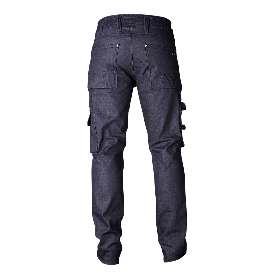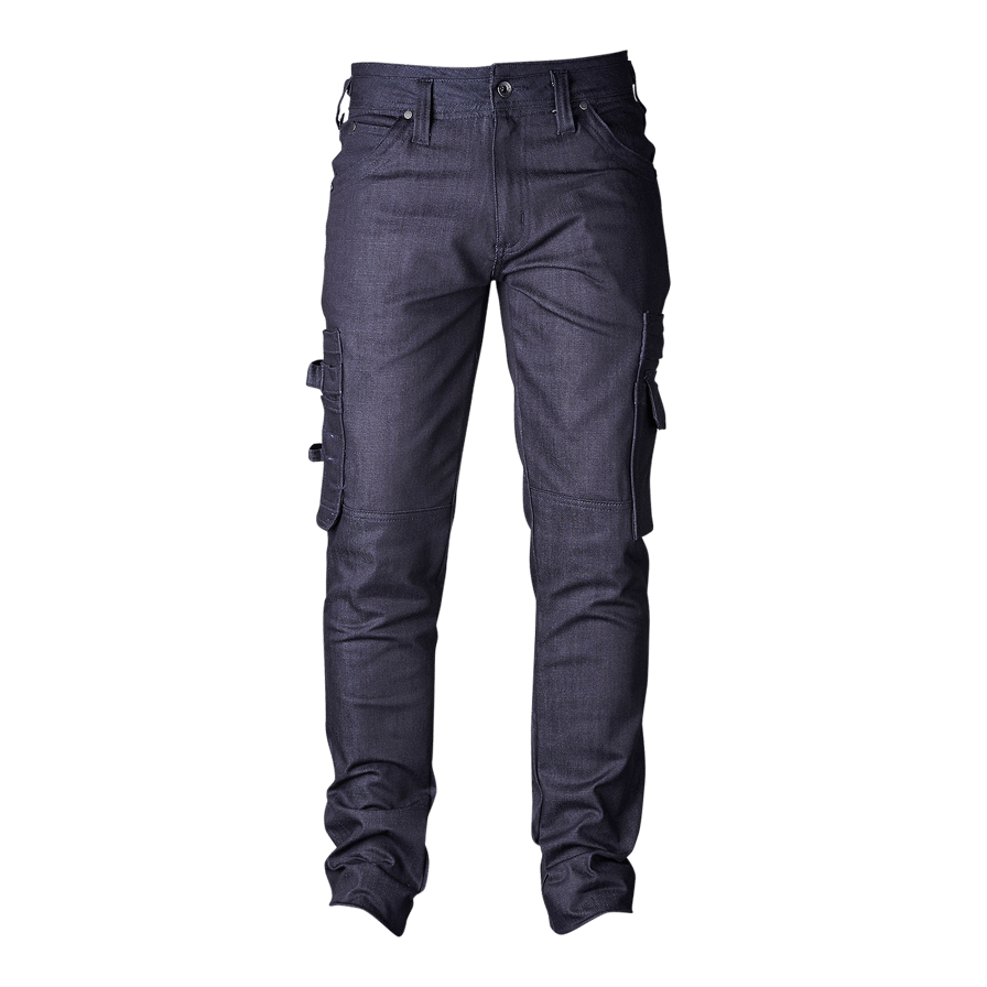 Två framfickor. Två bakfickor. Två benfickor, En tumstocksficka. Telefonficka. Pennfack. Förböjda ben.