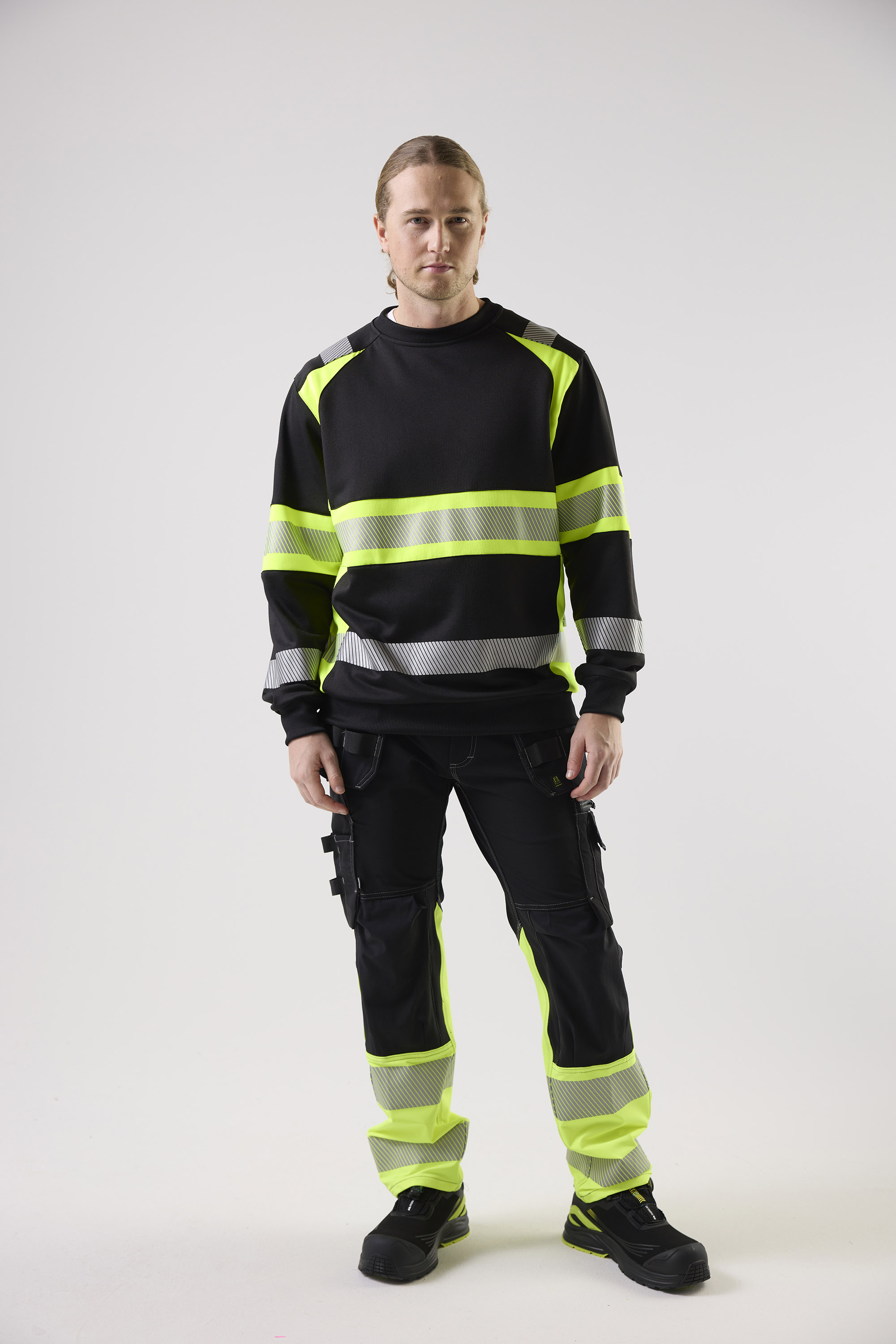 Varsel sweatshirt i klass 1 med segmenterad reflex, rund hals, och mudd i nederkant och ärmslut. Perfekt för hög synlighet och komfort i arbetsmiljöer.