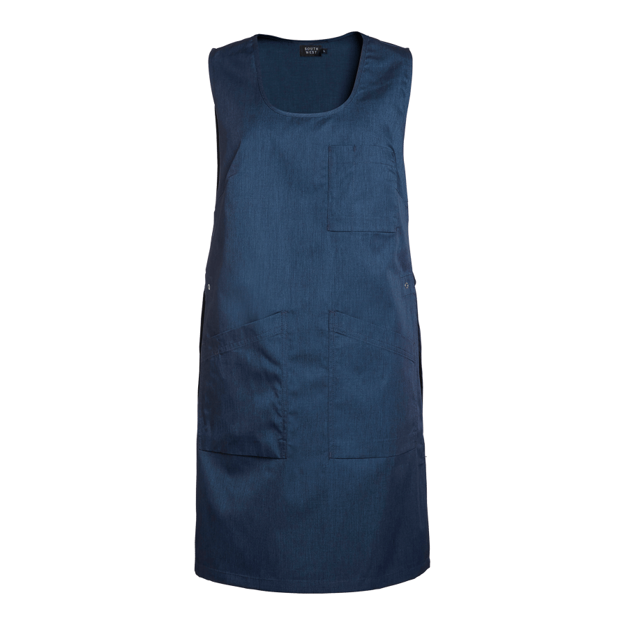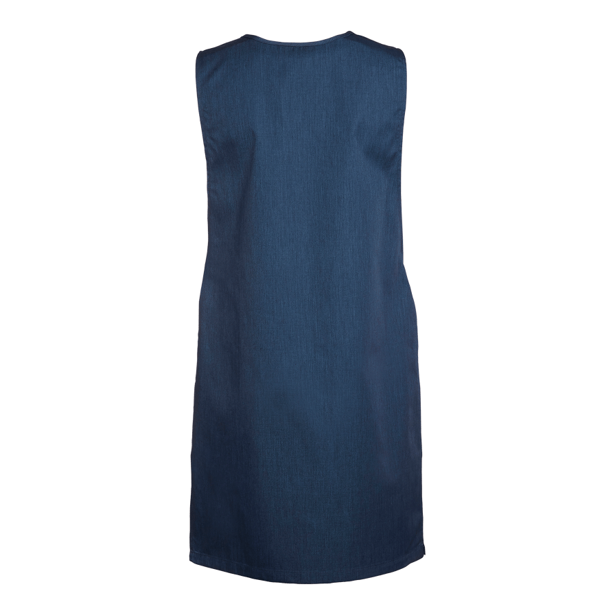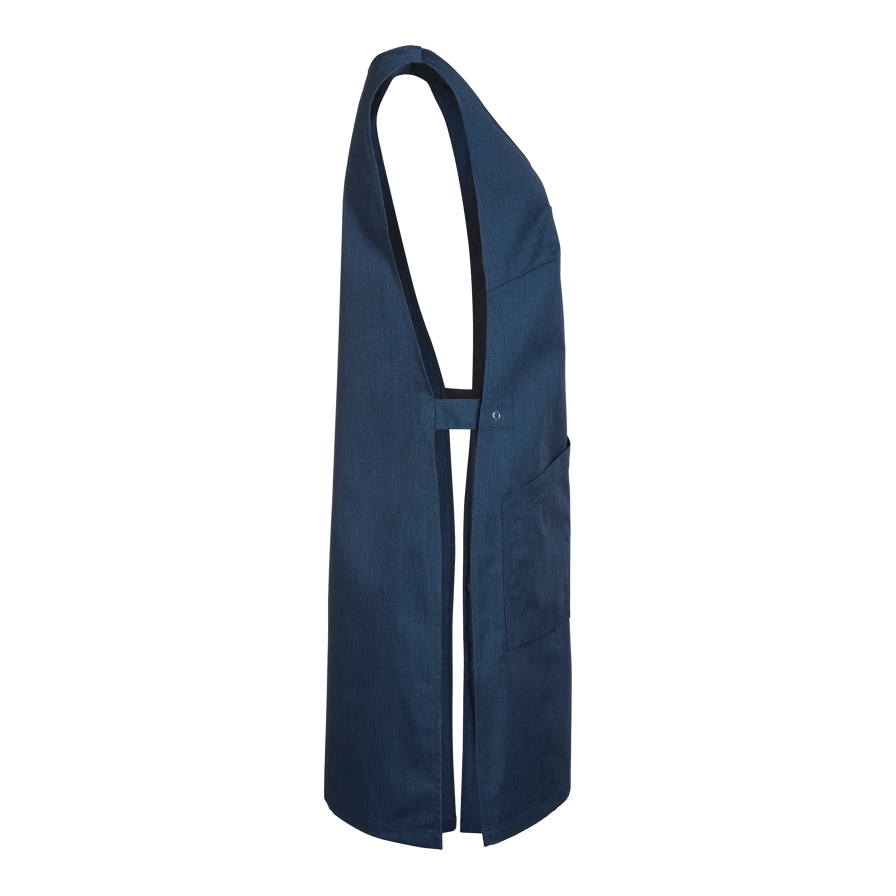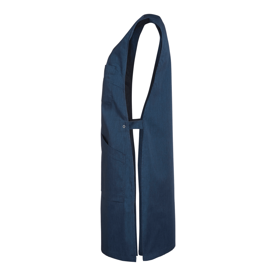 Lätt figursytt överdragsförkläde med två snedskurna framfickor, varav en med nyckelhållare och mobilficka. Utrustad med bröstficka och tampar i sidorna med ringknapp.