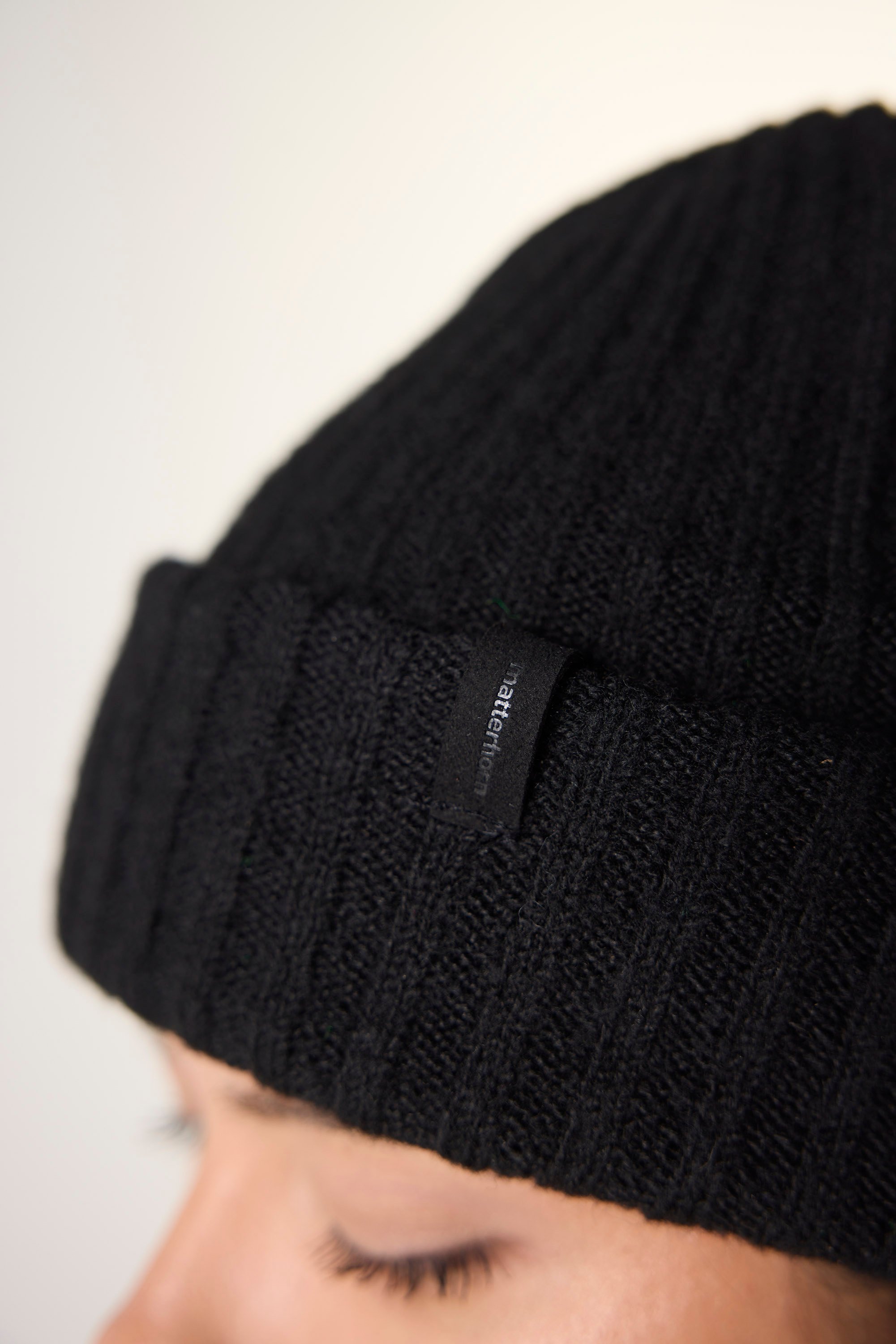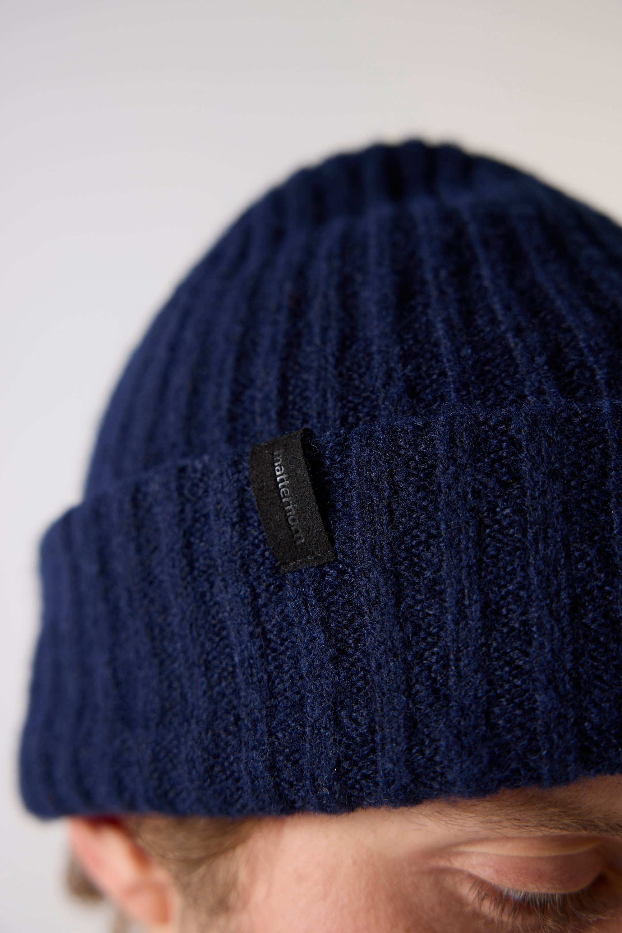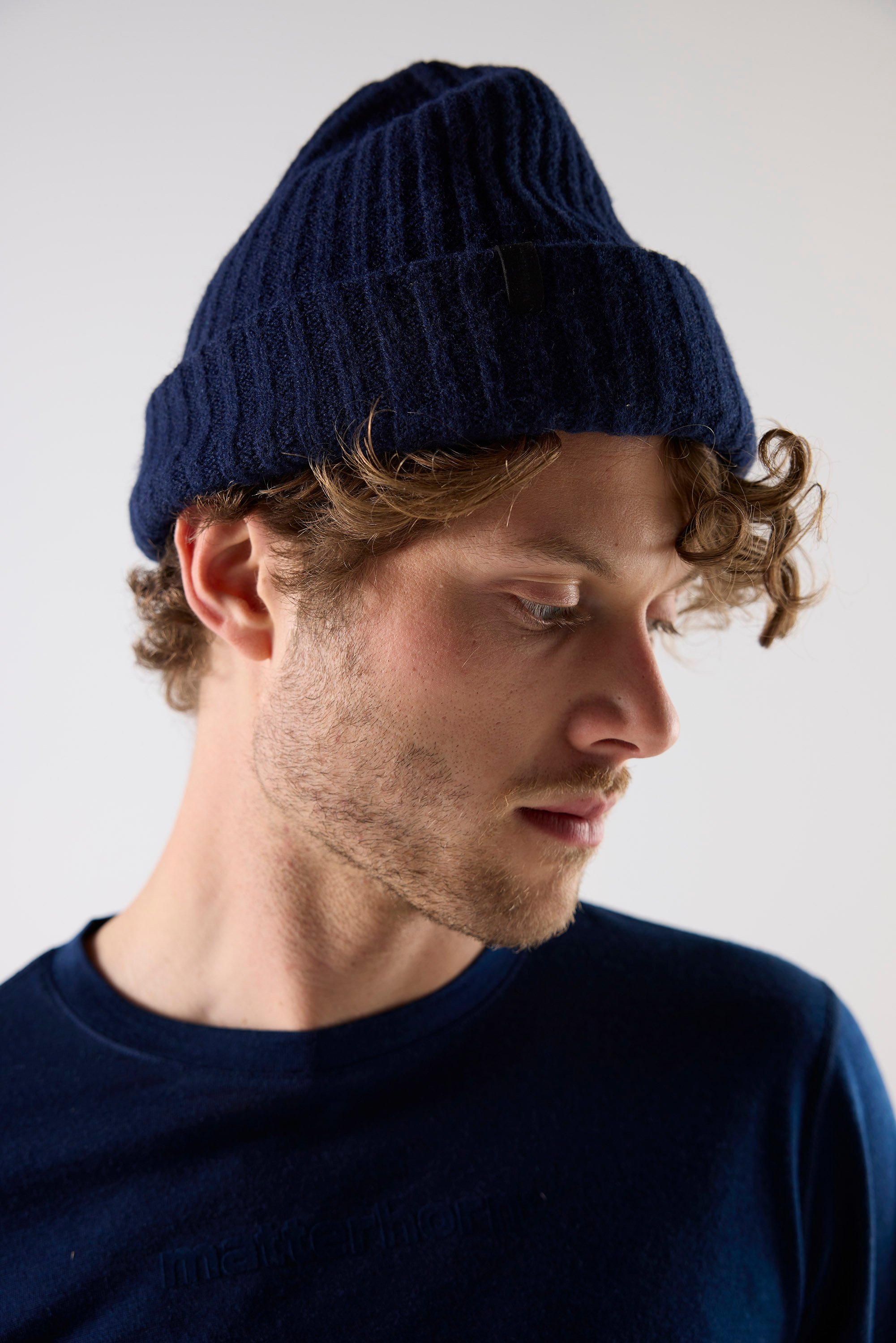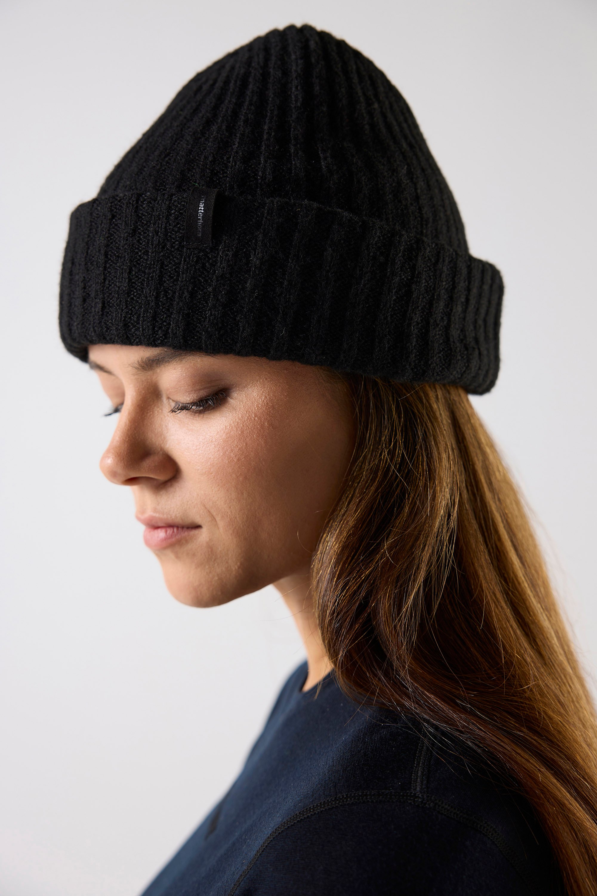 Grovstickad unisexmössa i ullblandning med bred uppvikt kant. Återvunnen polyester ger ett medvetet materialval med struktur, värme och stretch. Klassisk ribbstickning med rundad form. Finns i svart och mörkblå.