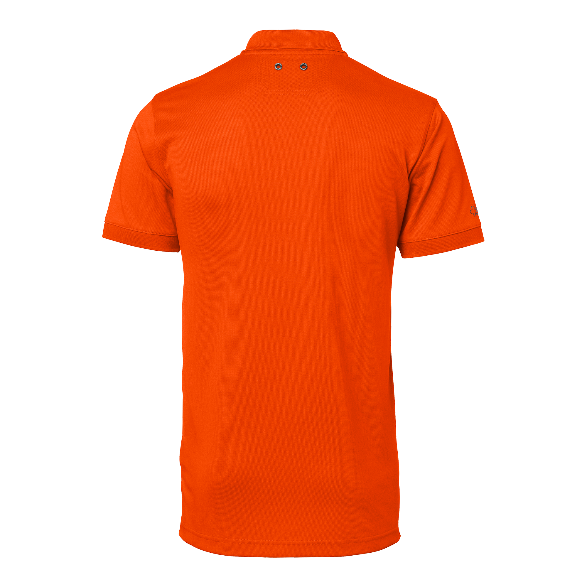 Funktionspiké med mjuk känsla, avvikande färg på knappar och knappslå. Eyelets under ärmen och på nackplattan. Kantband i nacke och sprund. Silikonlogotyp tryckt på höger ärm.