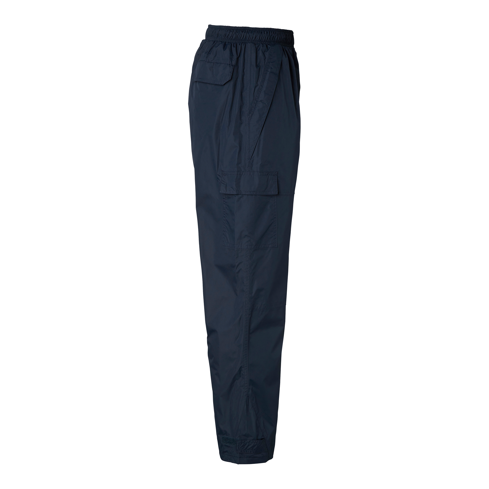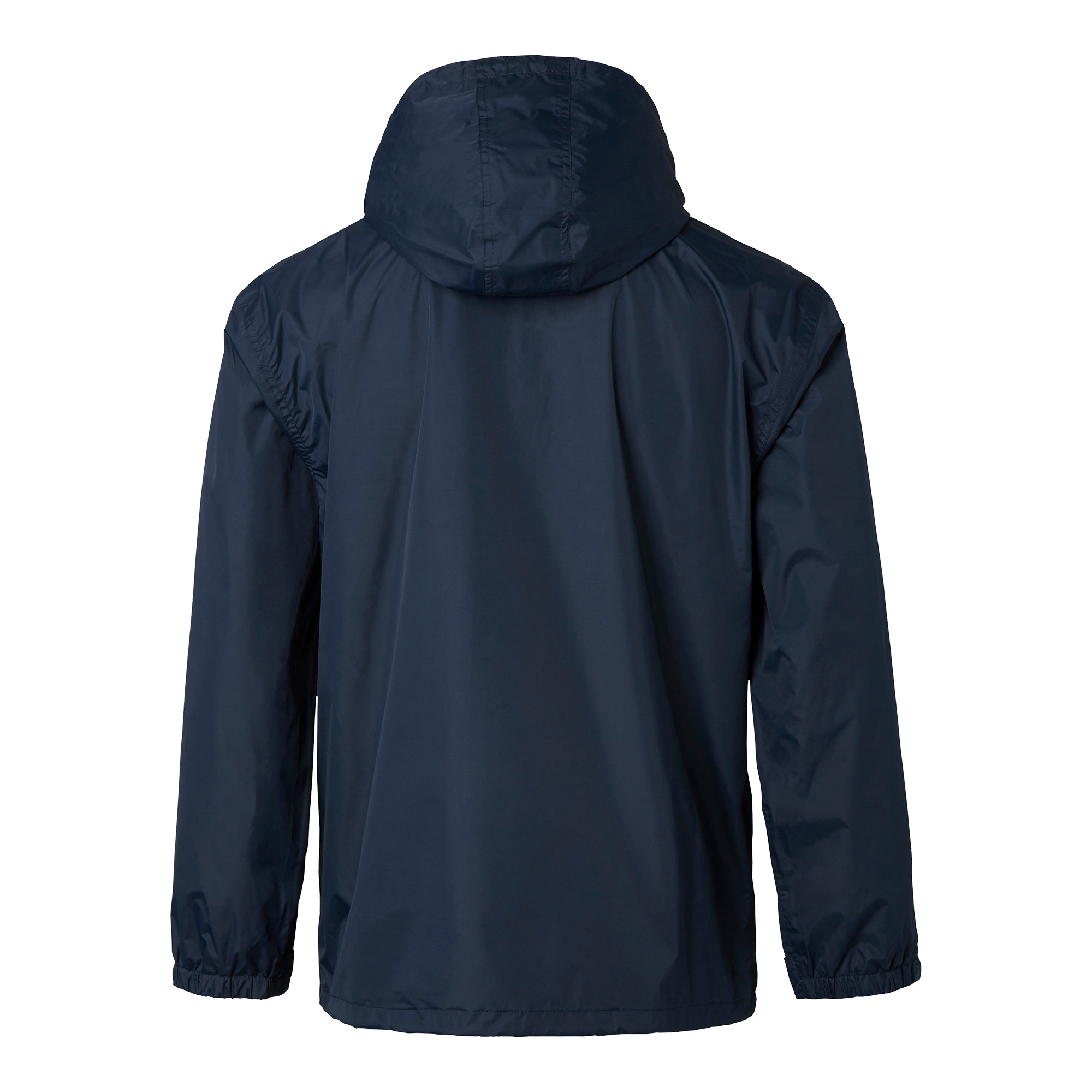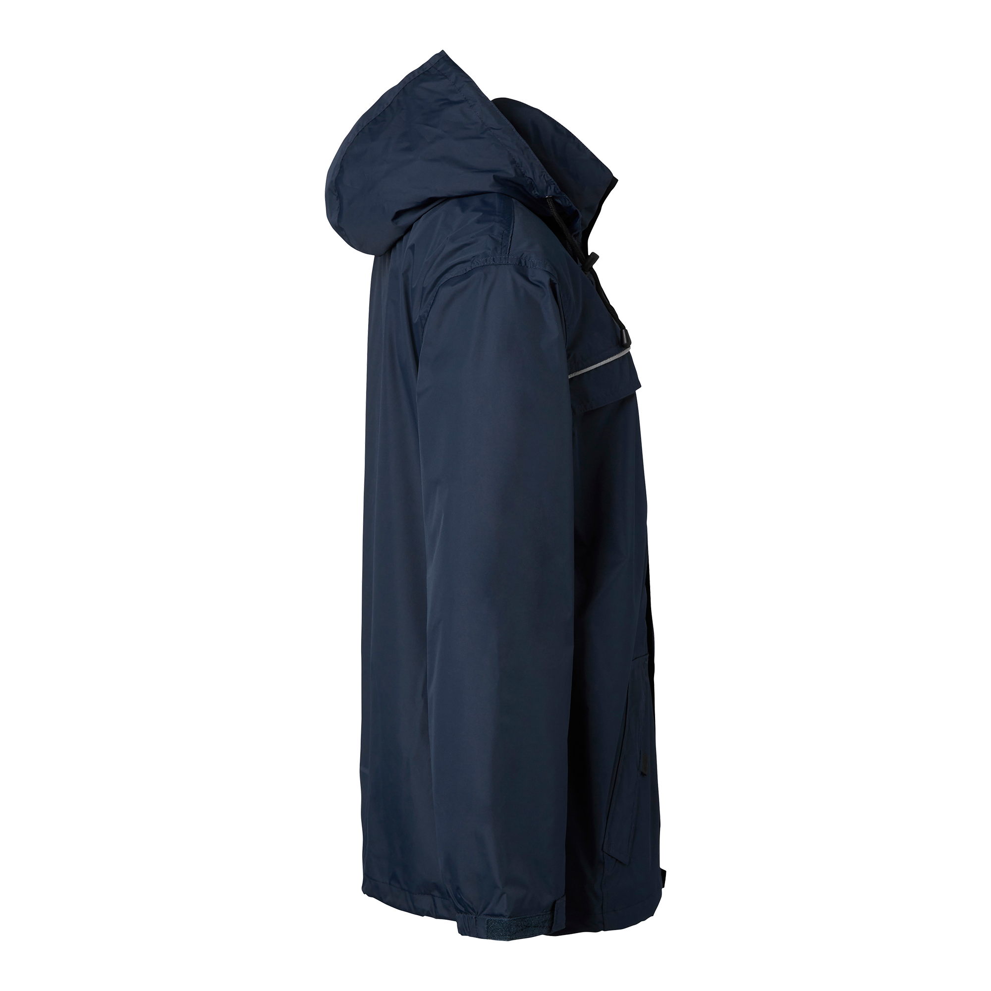Komplett regnställ med tejpade sömmar. Jacka med dold huva, justerbara ärmslut och nederkant. Två framfickor och en innerficka med dragkedja. Byxor med fickor och kardborreknäppning samt reglerbara benslut.