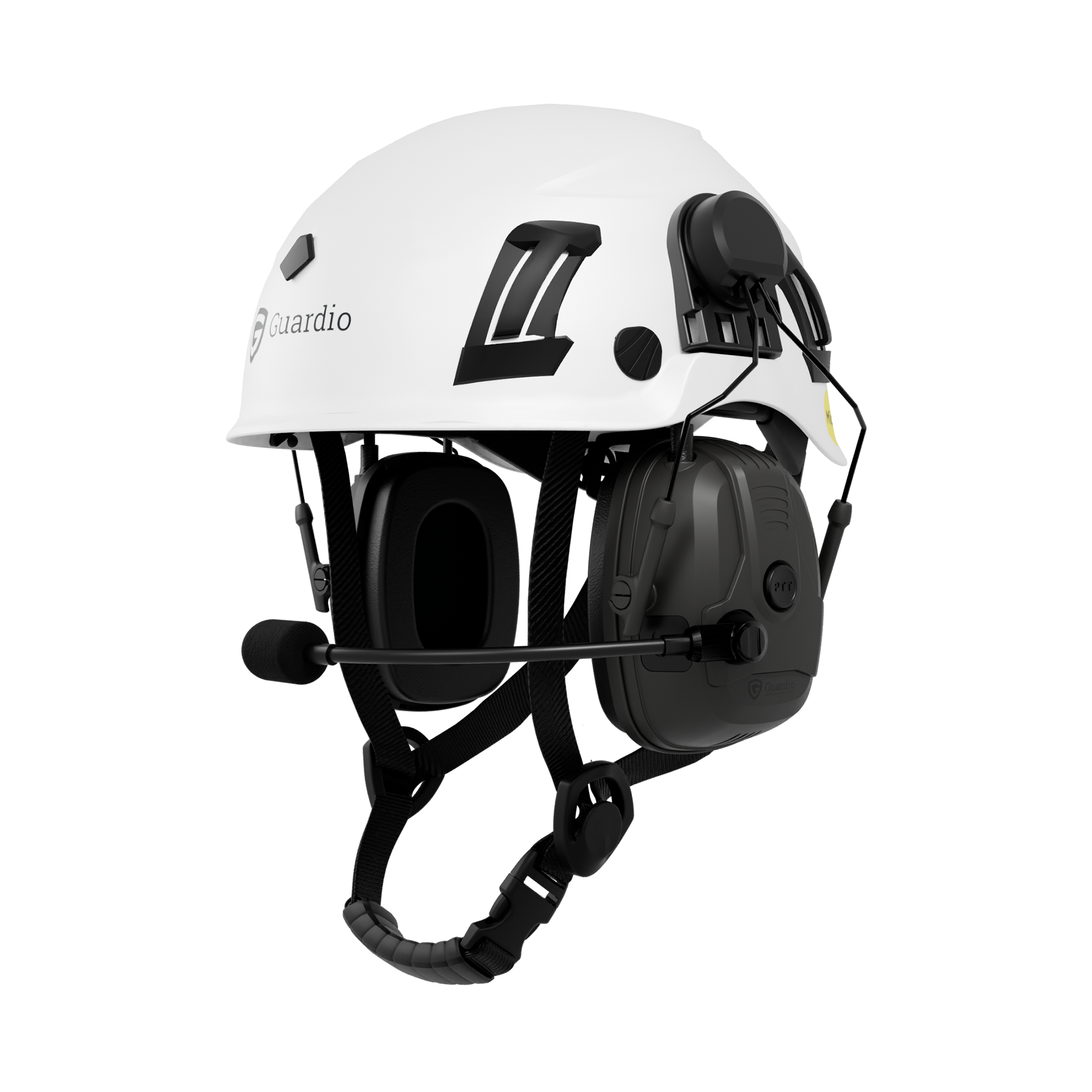 Guardio Freebird COM hörselskydd med brusreducerande bommikrofon, talförbättringsteknologi, och 16 kanaler i PMR446MHz. Enkel omställning mellan hjässbygel och hjälmfäste.